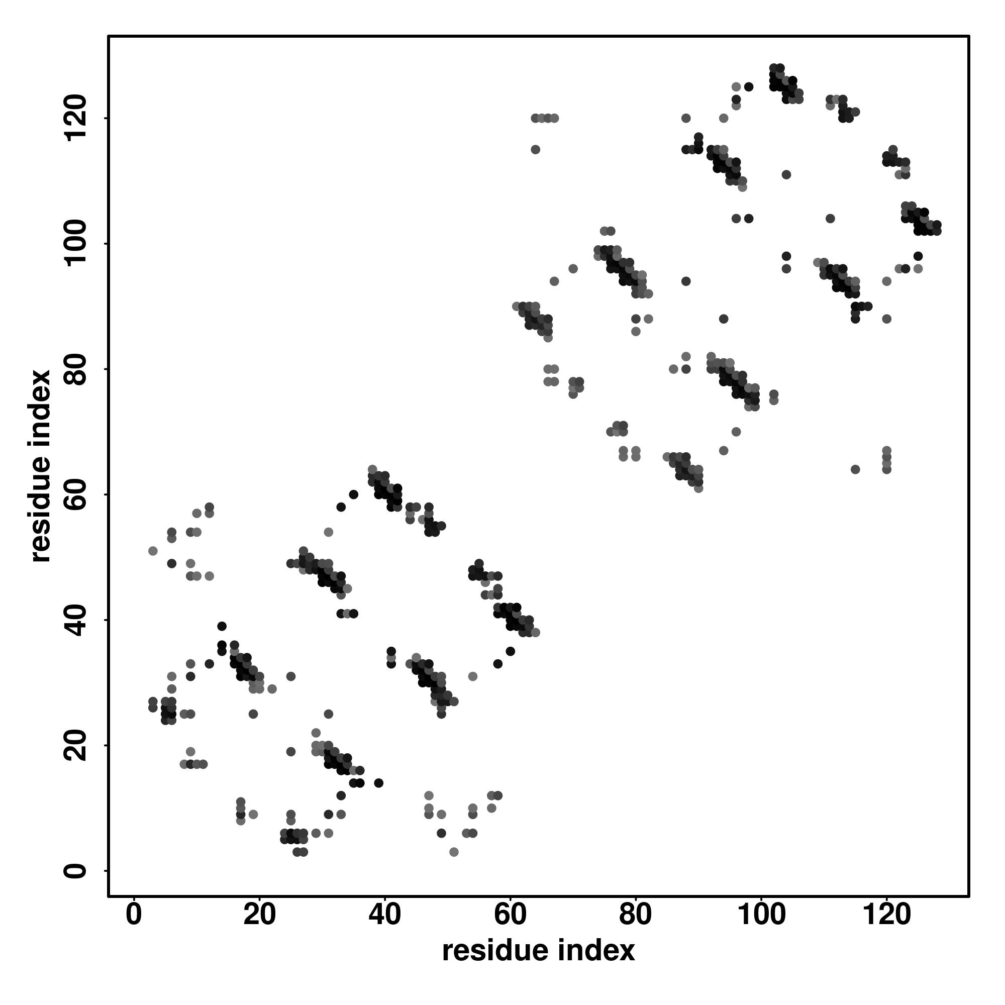 For the contact map, each dot represents a residue pair with predicted contact,