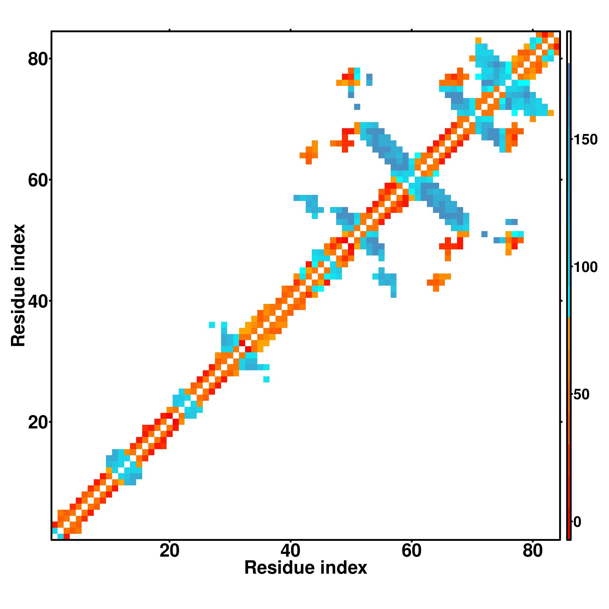 while for the distance map and hydrogen bond network, a color scale represents a distance of 1-20+ angstroms or a angle of 0-180 degree.