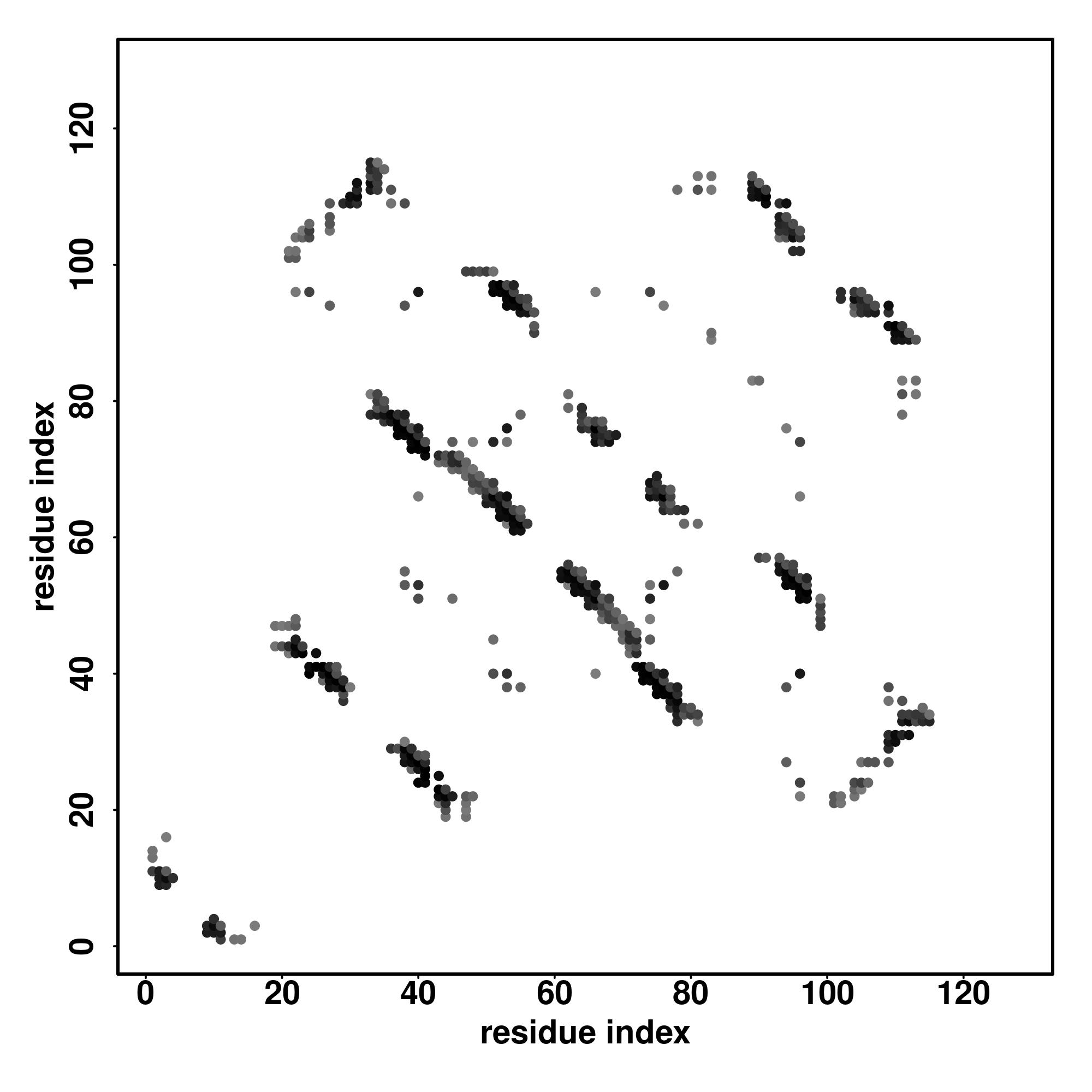For the contact map, each dot represents a residue pair with predicted contact,