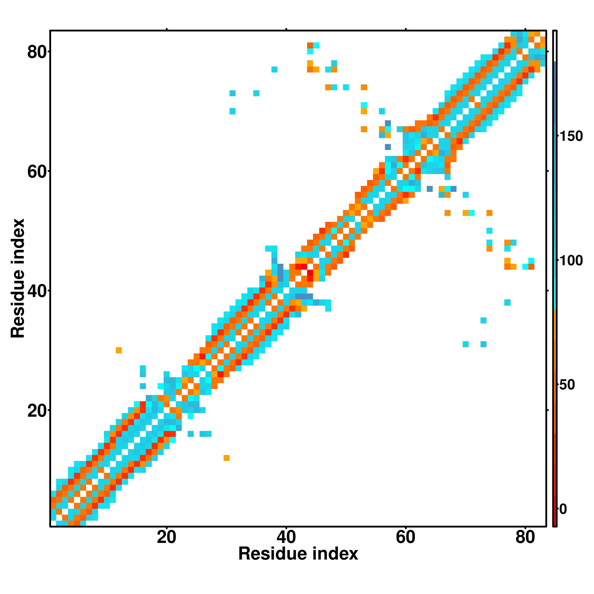 while for the distance map and hydrogen bond network, a color scale represents a distance of 1-20+ angstroms or a angle of 0-180 degree.