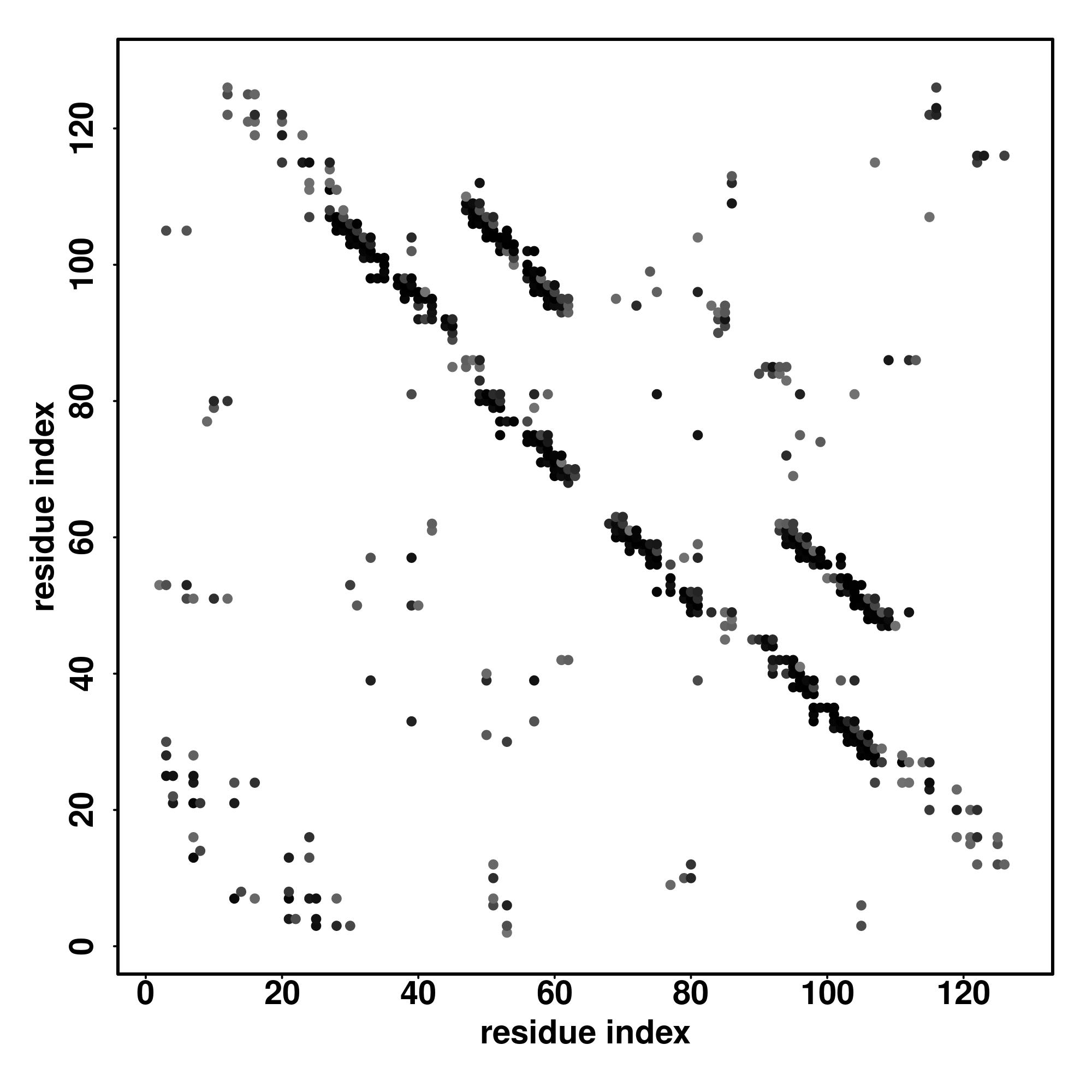 For the contact map, each dot represents a residue pair with predicted contact,