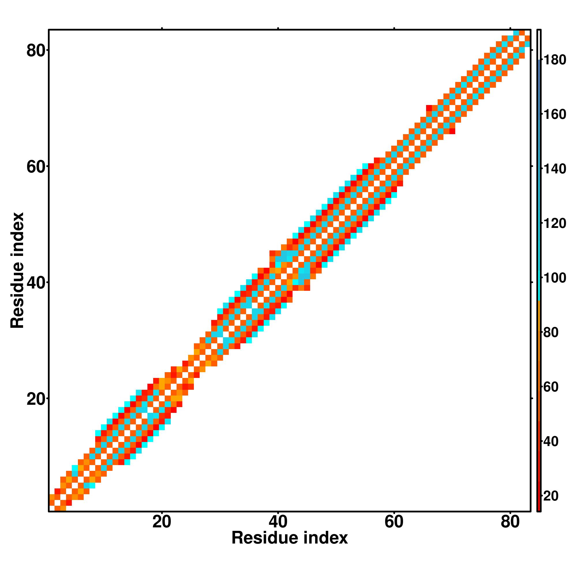 while for the distance map and hydrogen bond network, a color scale represents a distance of 1-20+ angstroms or a angle of 0-180 degree.