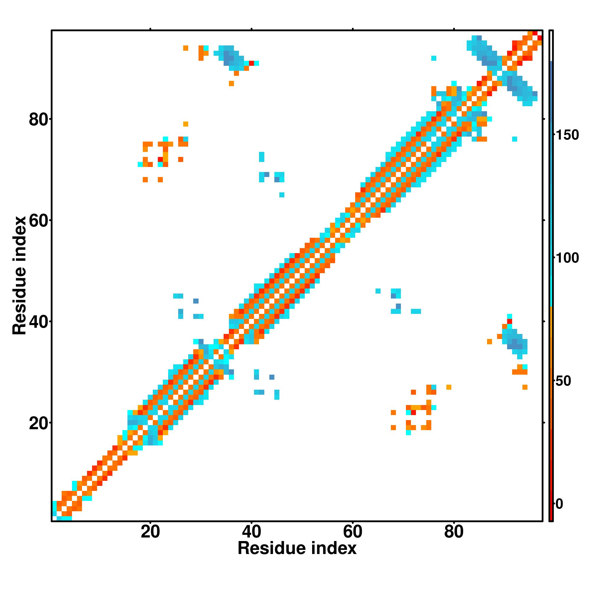 while for the distance map and hydrogen bond network, a color scale represents a distance of 1-20+ angstroms or a angle of 0-180 degree.