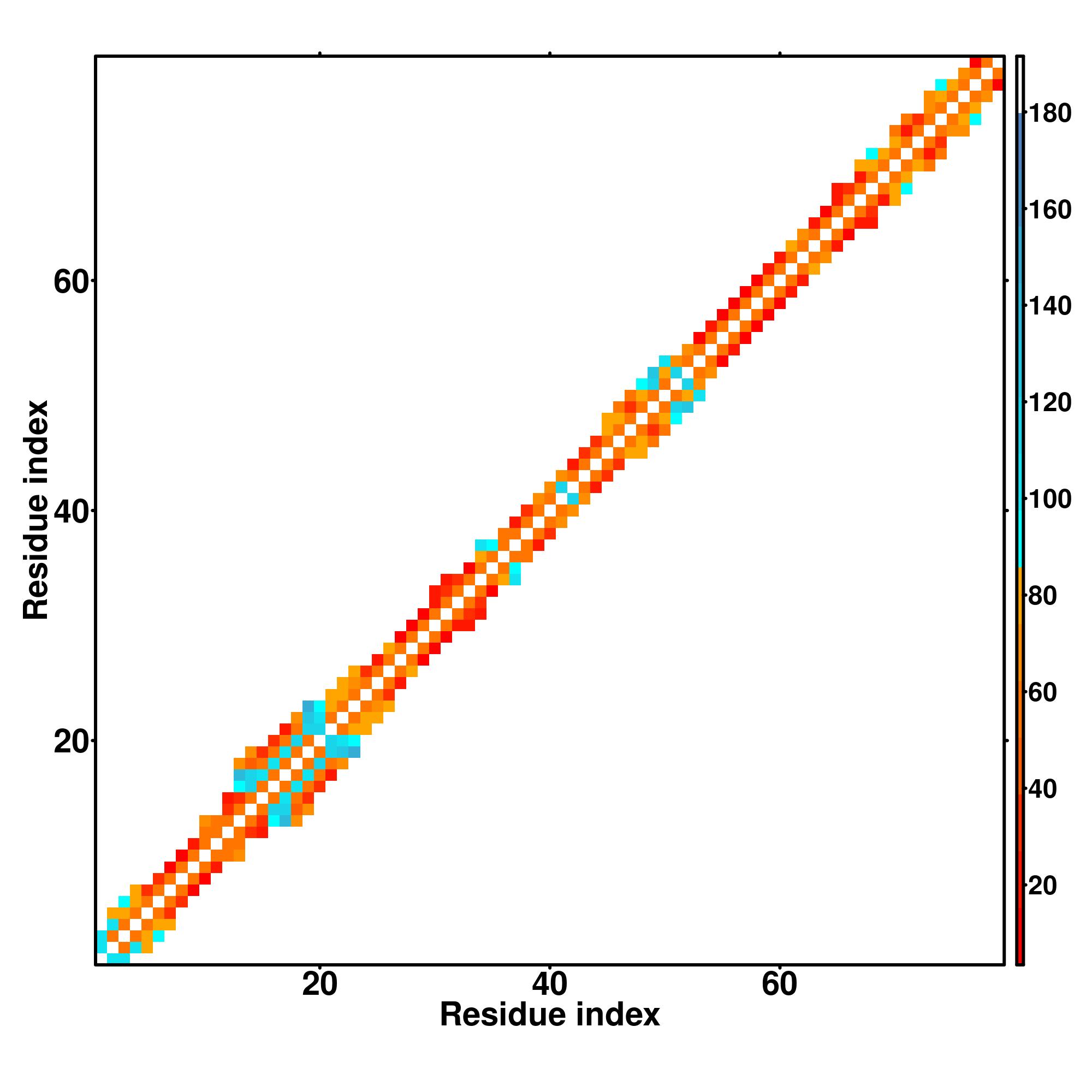while for the distance map and hydrogen bond network, a color scale represents a distance of 1-20+ angstroms or a angle of 0-180 degree.