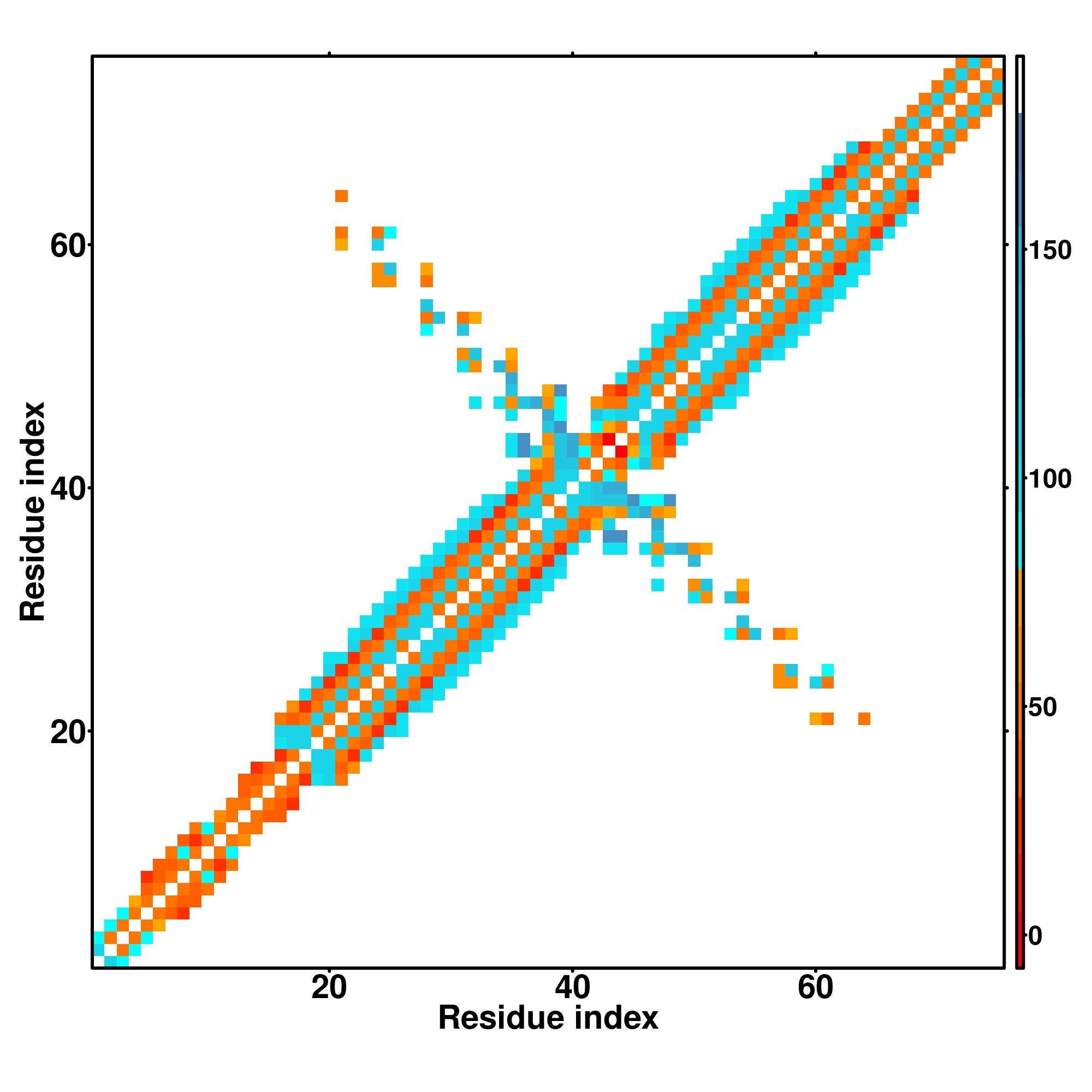 while for the distance map and hydrogen bond network, a color scale represents a distance of 1-20+ angstroms or a angle of 0-180 degree.