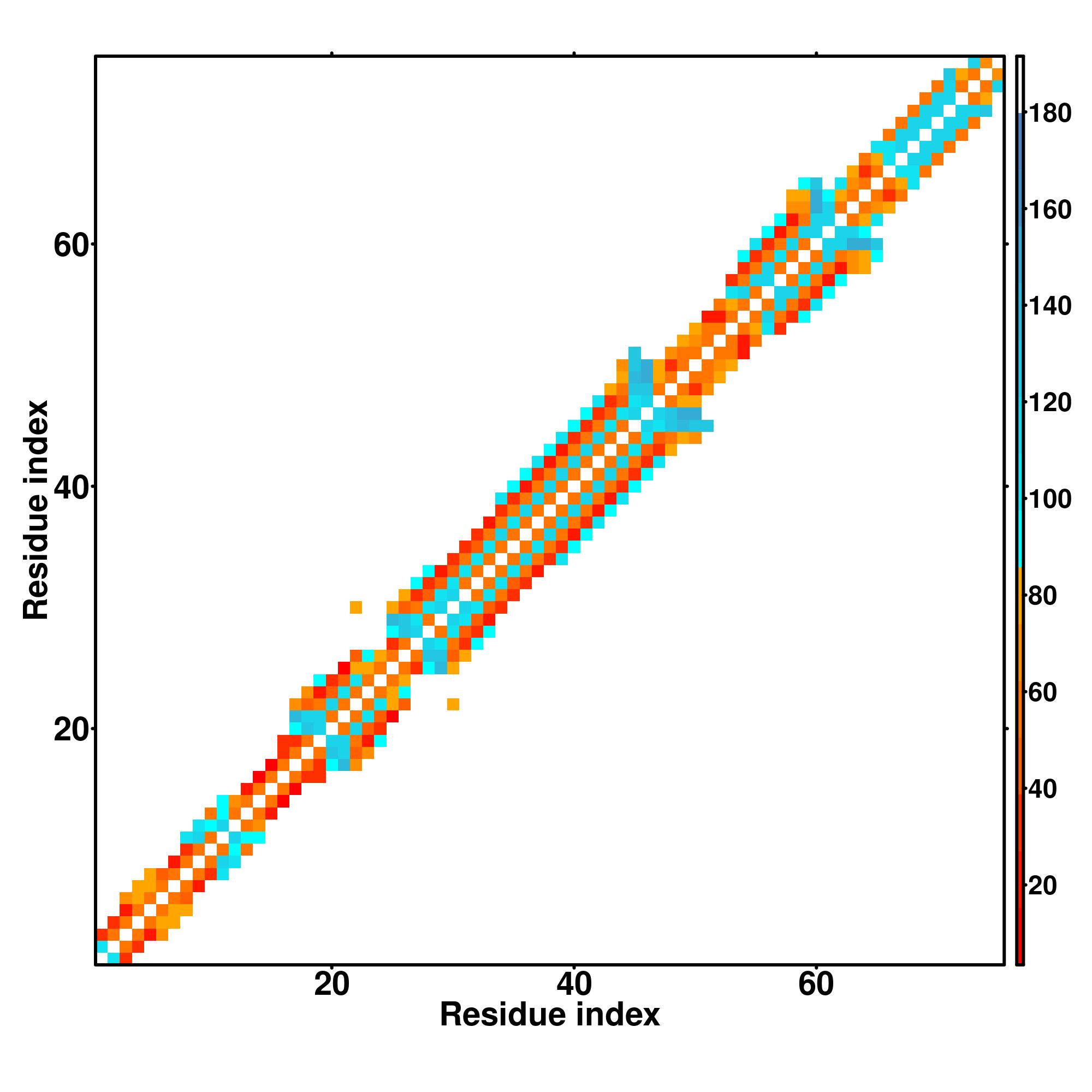 while for the distance map and hydrogen bond network, a color scale represents a distance of 1-20+ angstroms or a angle of 0-180 degree.