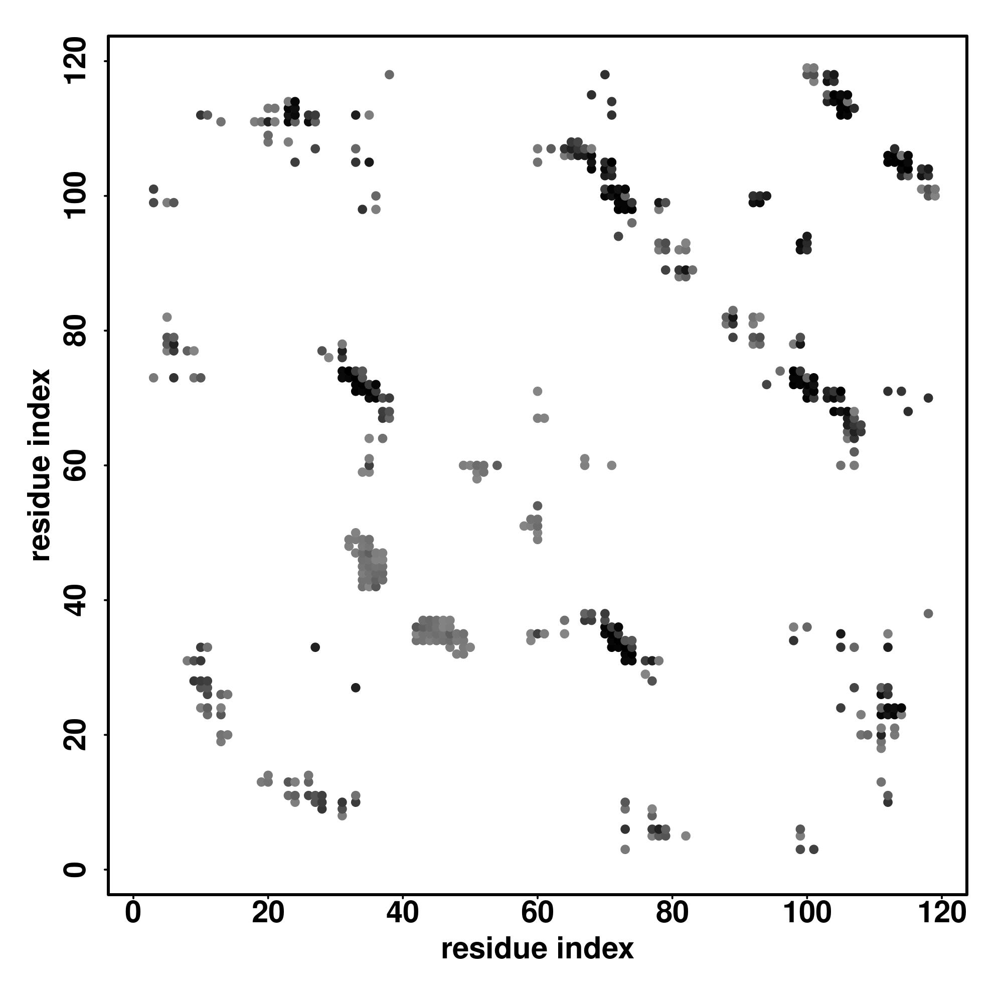 For the contact map, each dot represents a residue pair with predicted contact,