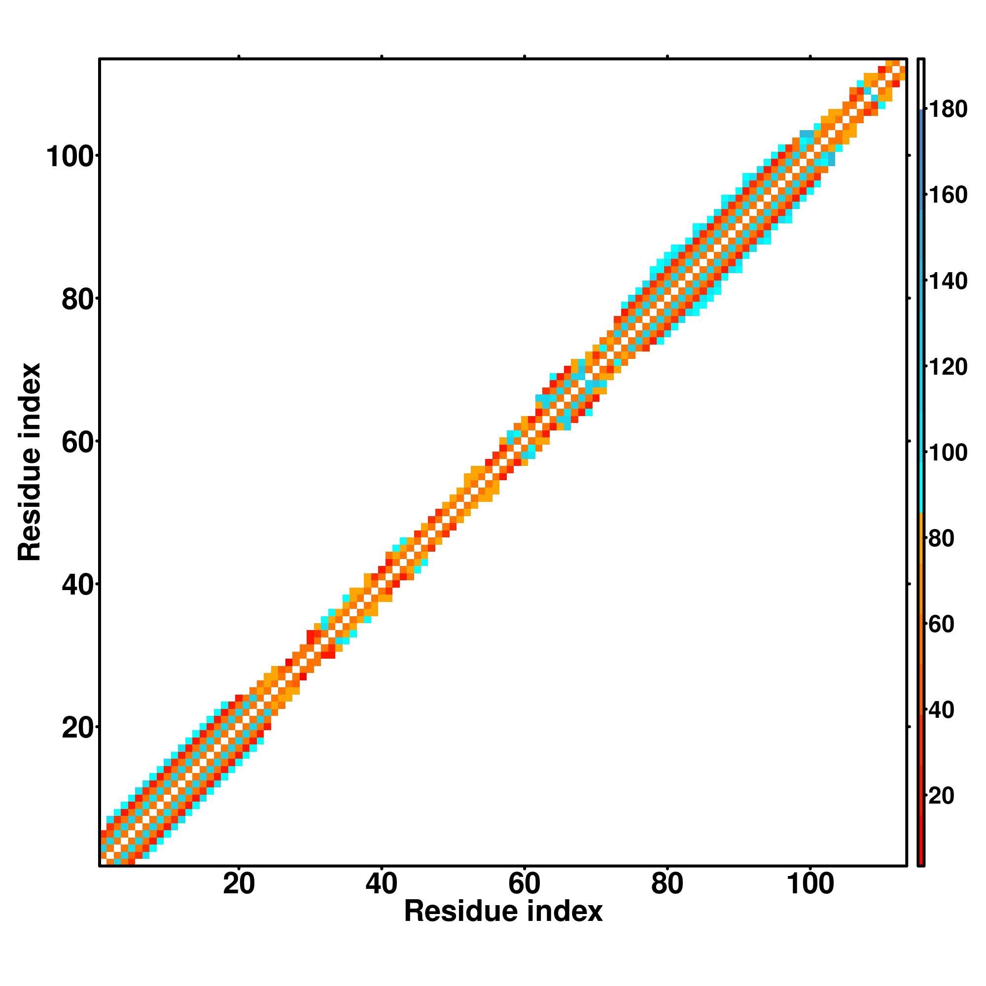 while for the distance map and hydrogen bond network, a color scale represents a distance of 1-20+ angstroms or a angle of 0-180 degree.
