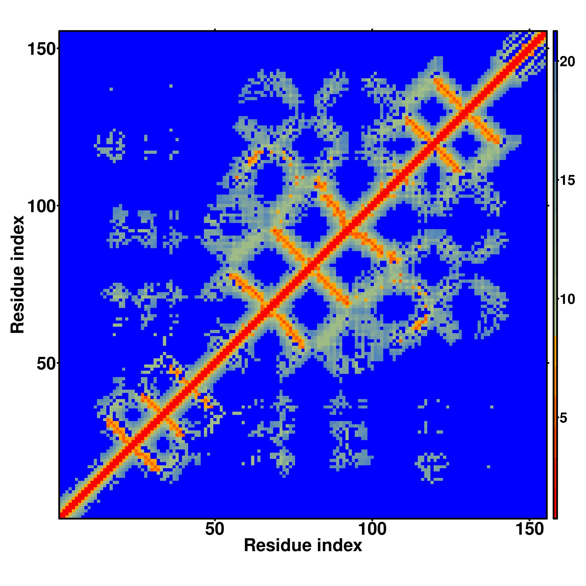 In the contact, distance map and hydrogen bond networks, the axes mark the residue index along the sequence.