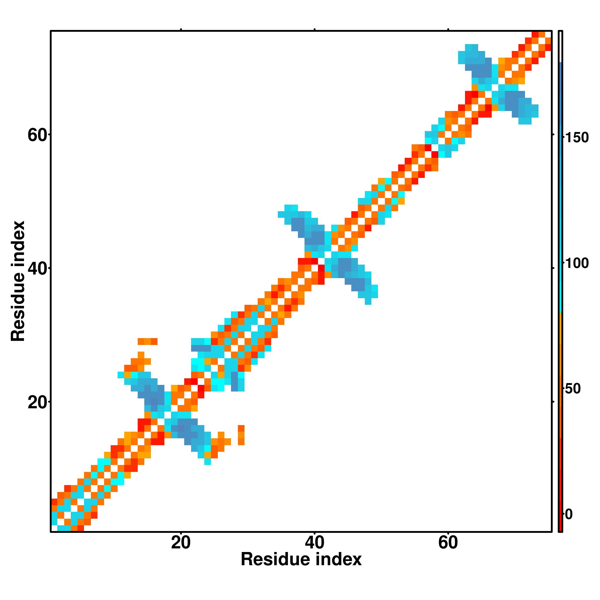 while for the distance map and hydrogen bond network, a color scale represents a distance of 1-20+ angstroms or a angle of 0-180 degree.