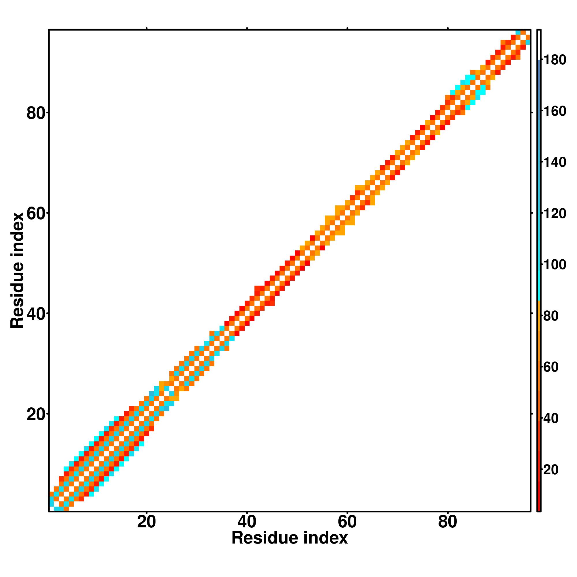 while for the distance map and hydrogen bond network, a color scale represents a distance of 1-20+ angstroms or a angle of 0-180 degree.