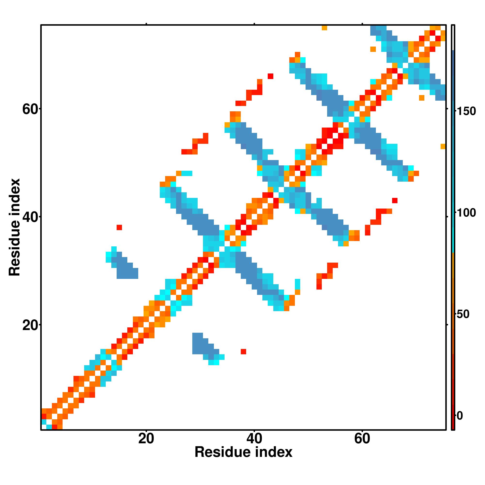 while for the distance map and hydrogen bond network, a color scale represents a distance of 1-20+ angstroms or a angle of 0-180 degree.