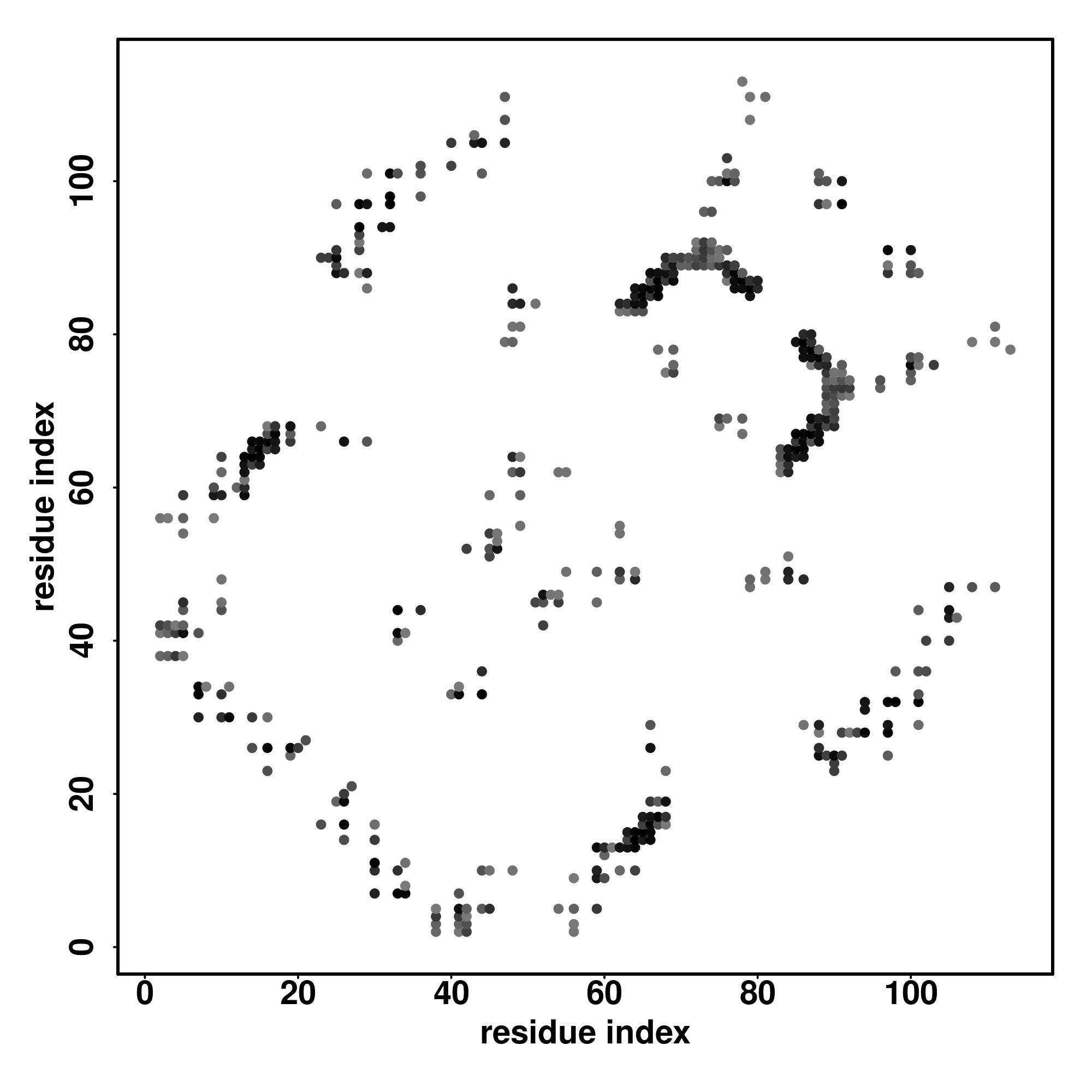 For the contact map, each dot represents a residue pair with predicted contact,