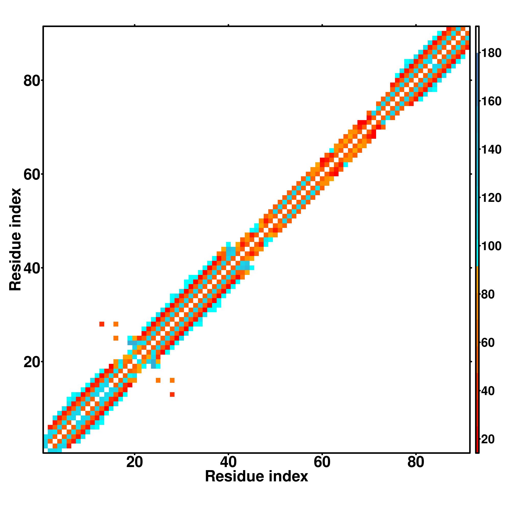while for the distance map and hydrogen bond network, a color scale represents a distance of 1-20+ angstroms or a angle of 0-180 degree.