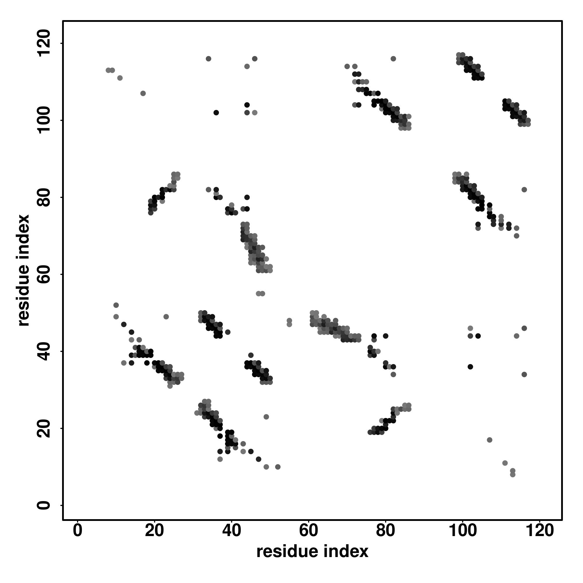 For the contact map, each dot represents a residue pair with predicted contact,