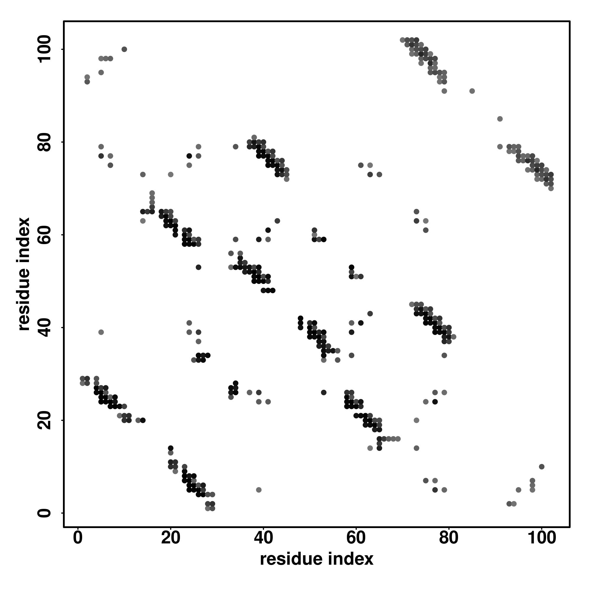 For the contact map, each dot represents a residue pair with predicted contact,