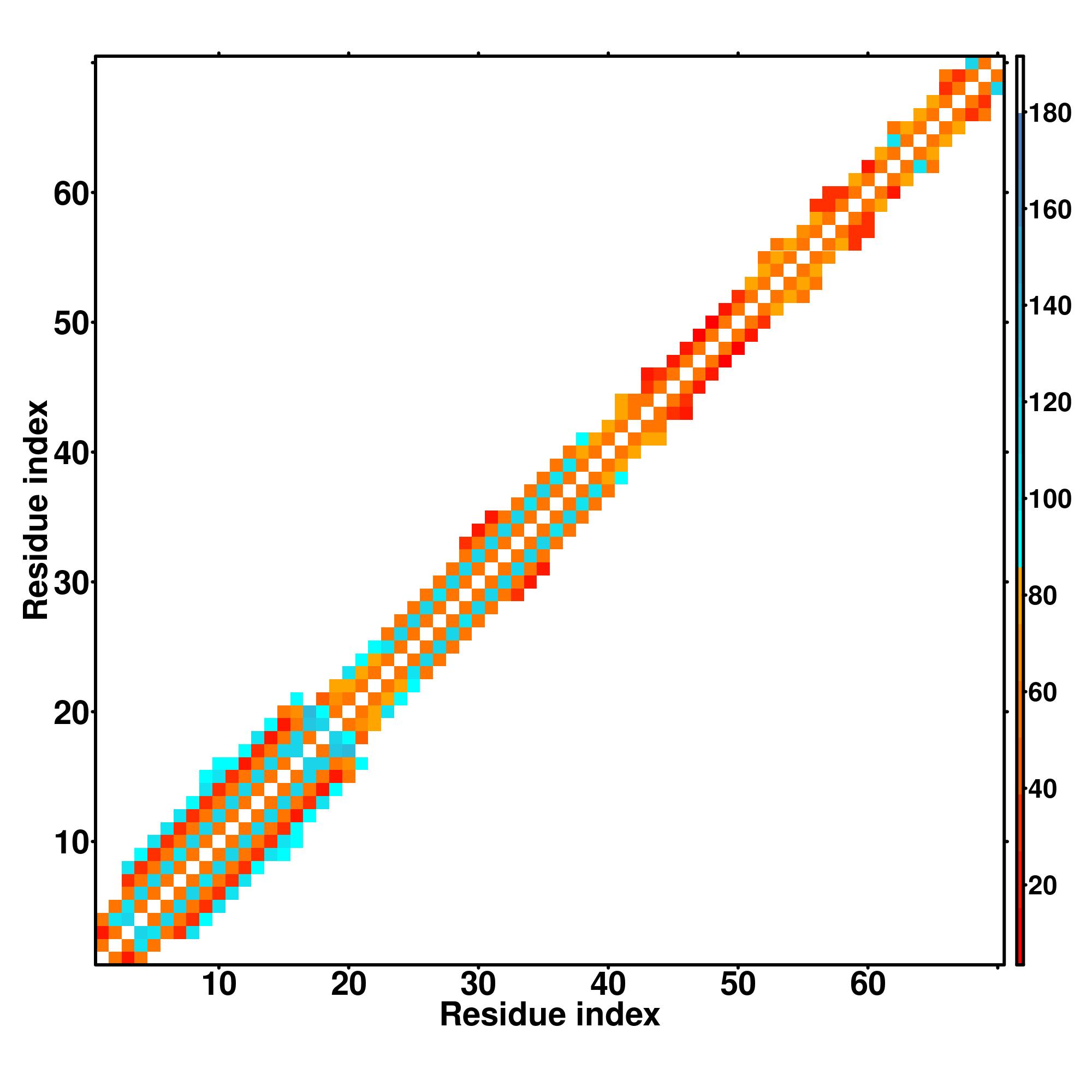 while for the distance map and hydrogen bond network, a color scale represents a distance of 1-20+ angstroms or a angle of 0-180 degree.