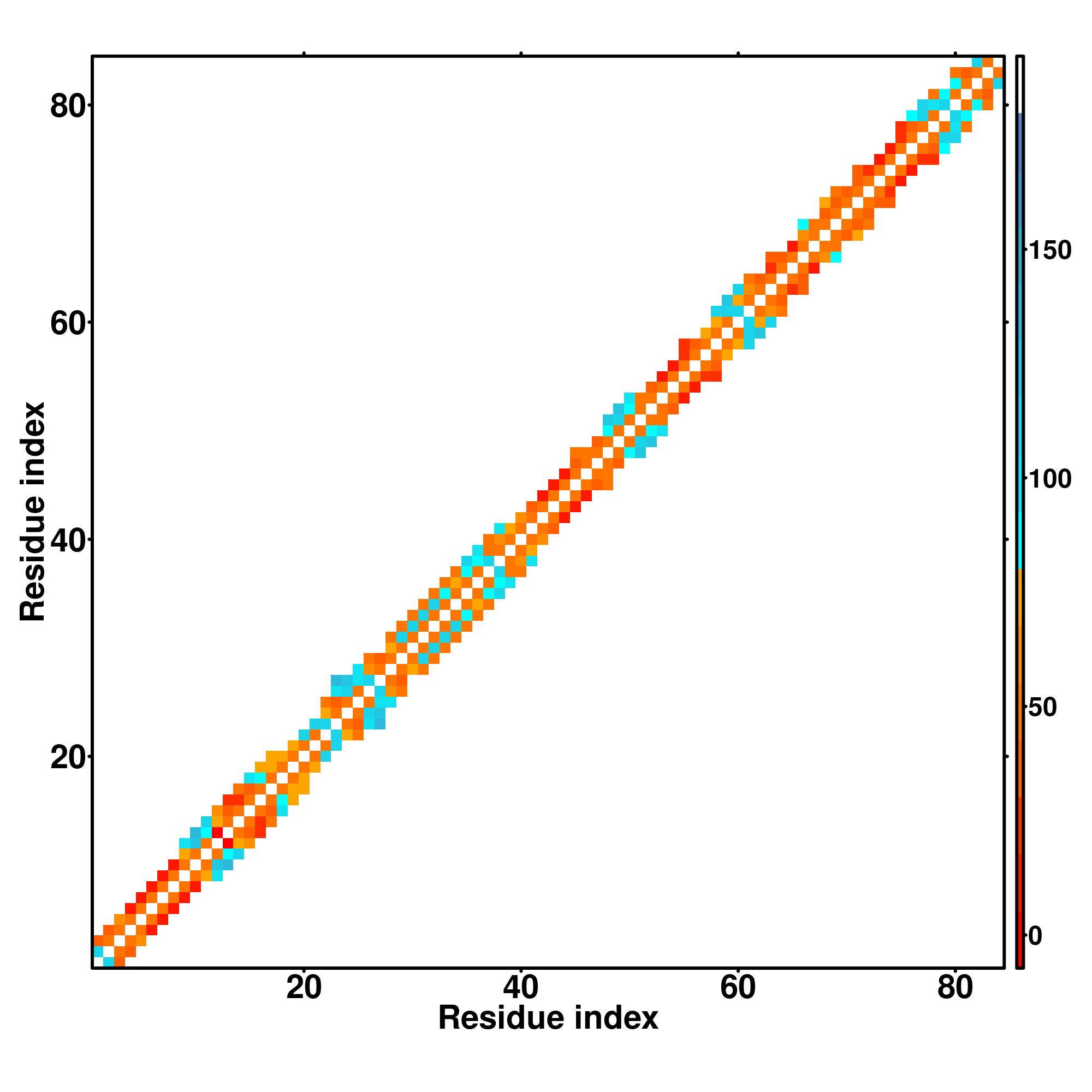 while for the distance map and hydrogen bond network, a color scale represents a distance of 1-20+ angstroms or a angle of 0-180 degree.