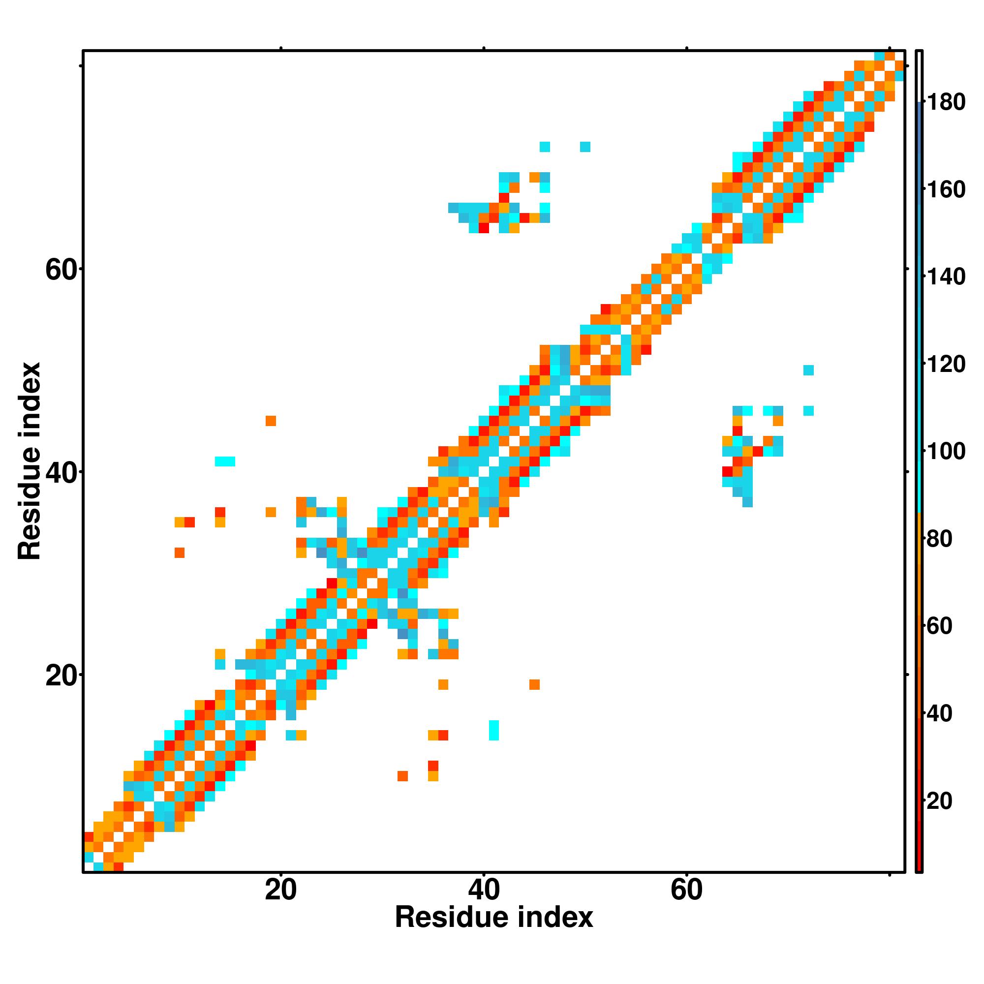 while for the distance map and hydrogen bond network, a color scale represents a distance of 1-20+ angstroms or a angle of 0-180 degree.
