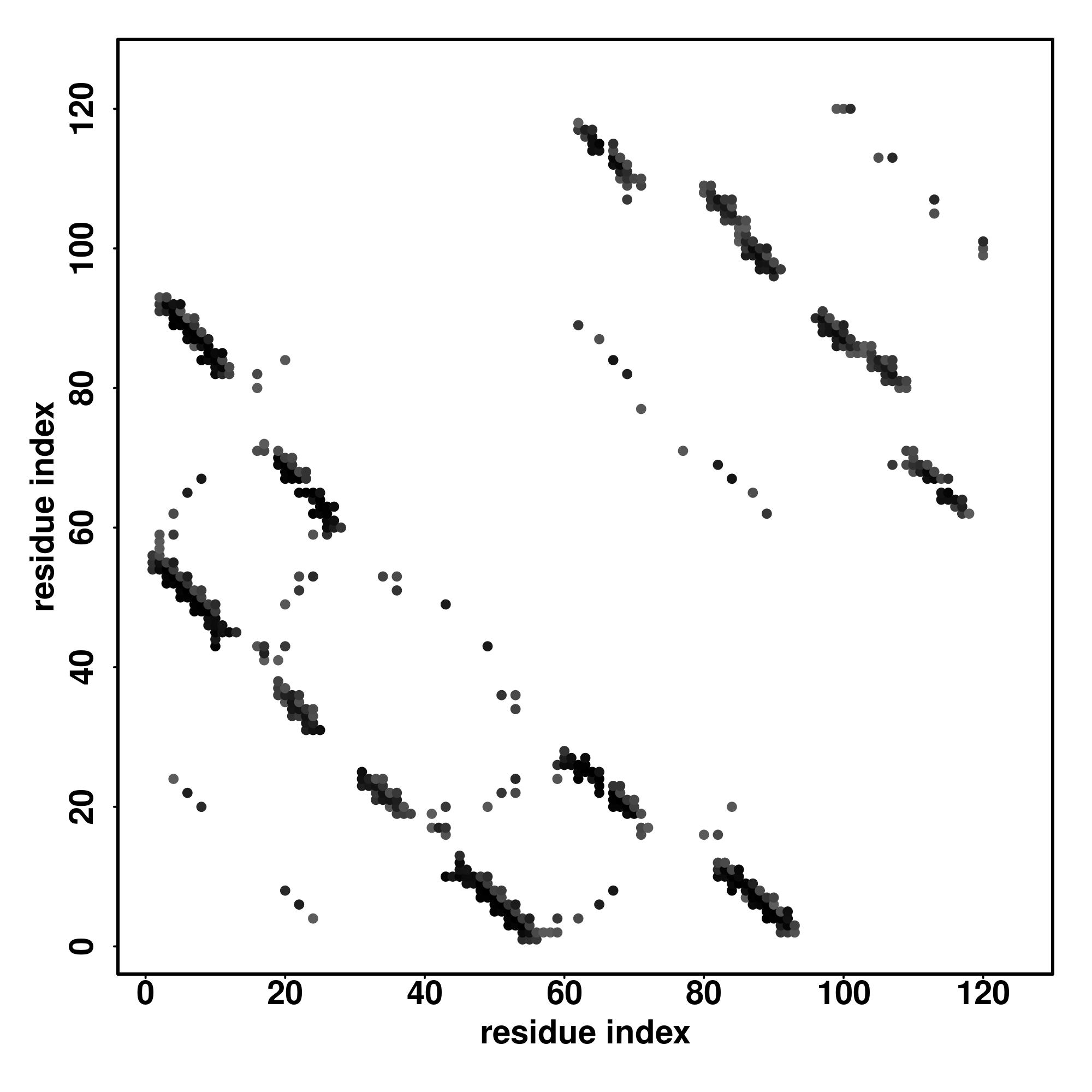 For the contact map, each dot represents a residue pair with predicted contact,