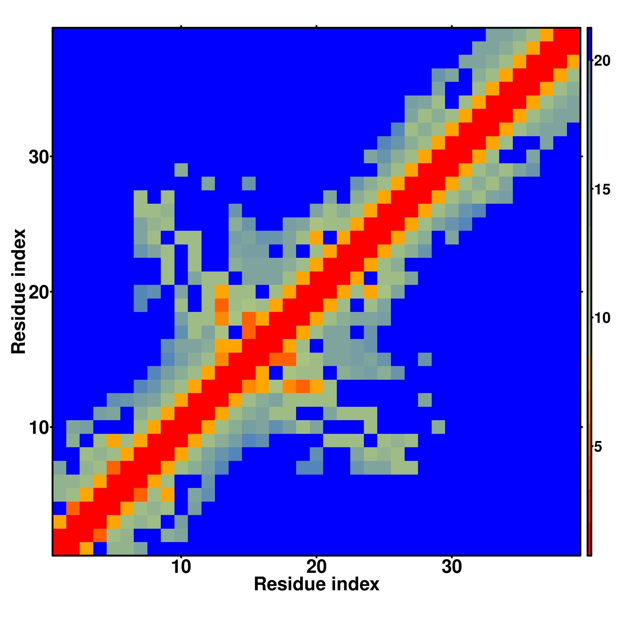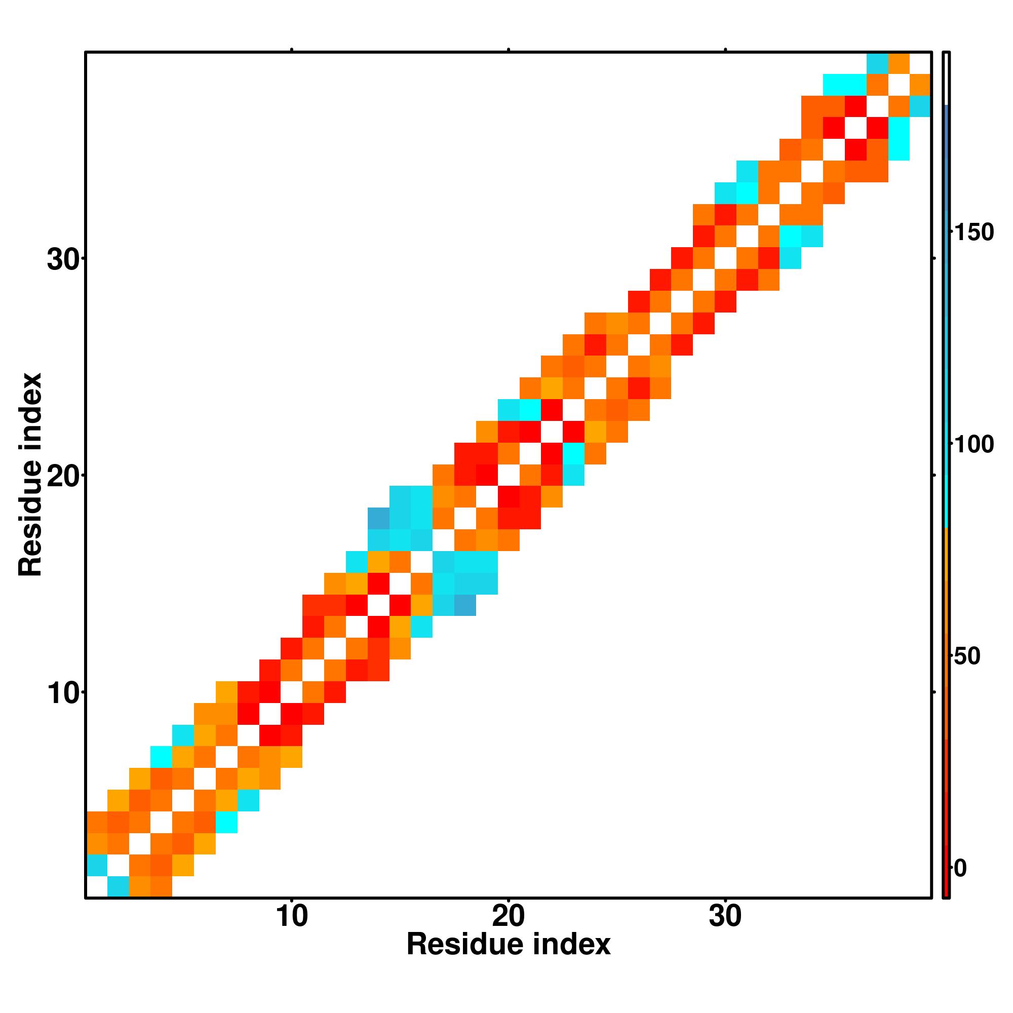 while for the distance map and hydrogen bond network, a color scale represents a distance of 1-20+ angstroms or a angle of 0-180 degree.
