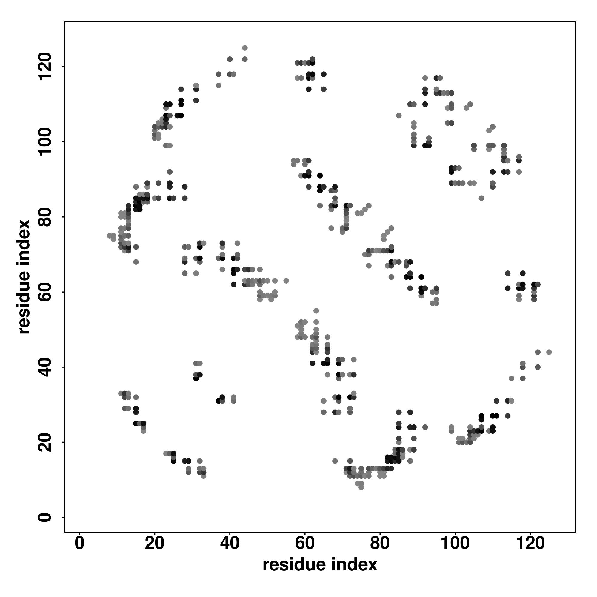 For the contact map, each dot represents a residue pair with predicted contact,