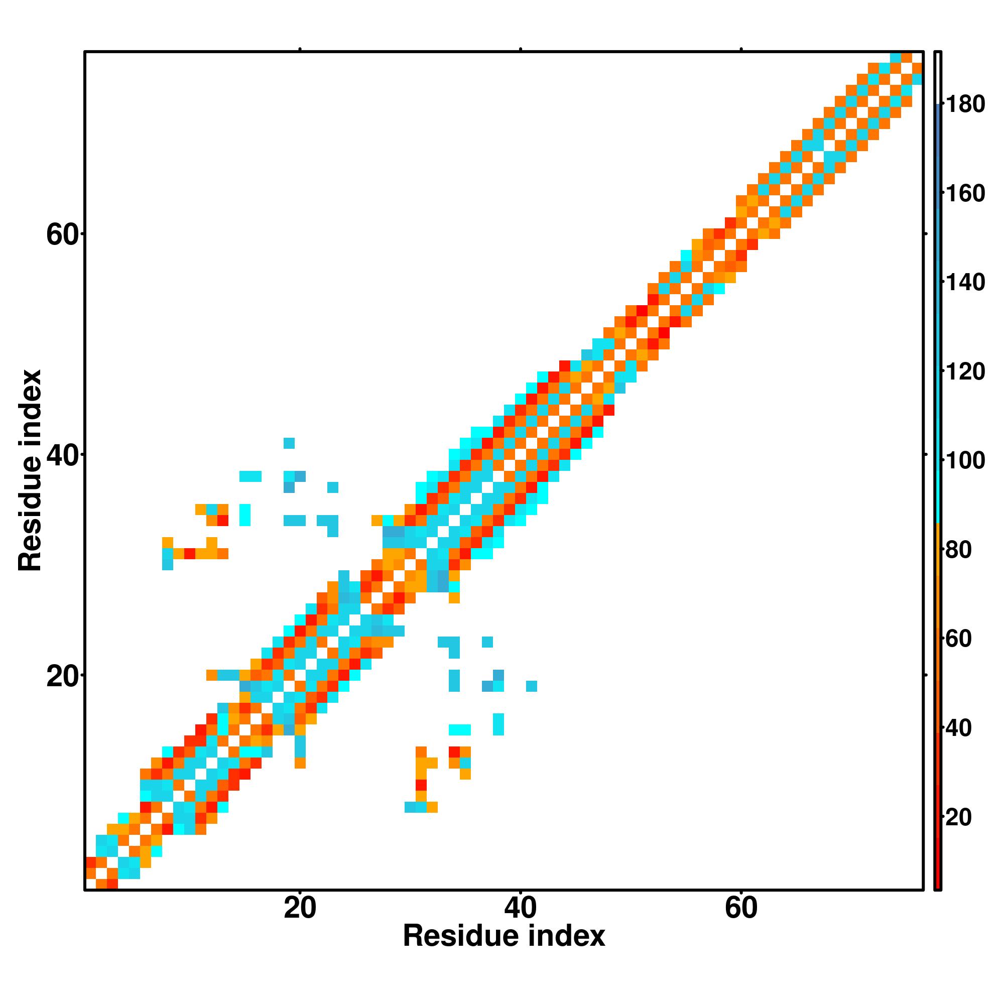 while for the distance map and hydrogen bond network, a color scale represents a distance of 1-20+ angstroms or a angle of 0-180 degree.