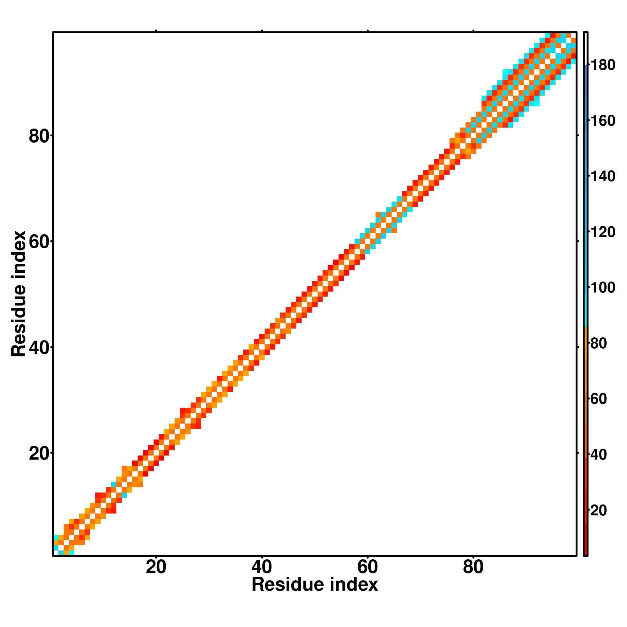 while for the distance map and hydrogen bond network, a color scale represents a distance of 1-20+ angstroms or a angle of 0-180 degree.