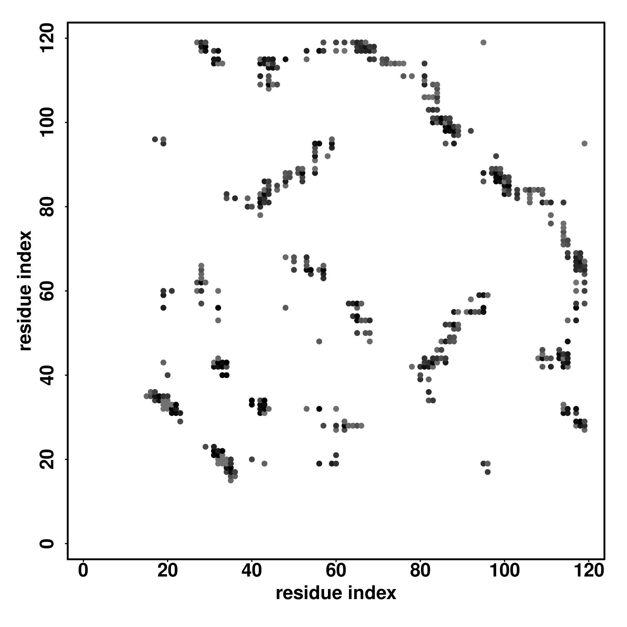 For the contact map, each dot represents a residue pair with predicted contact,