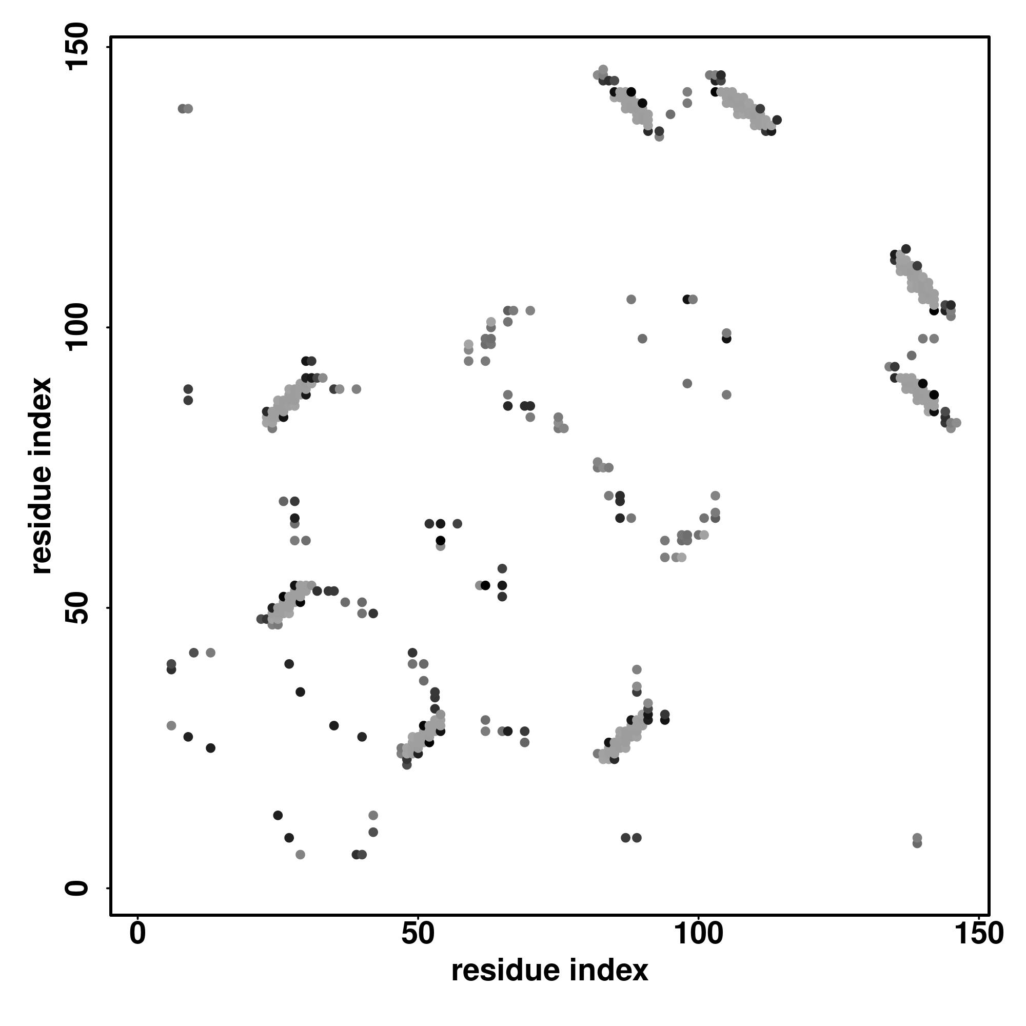 For the contact map, each dot represents a residue pair with predicted contact,