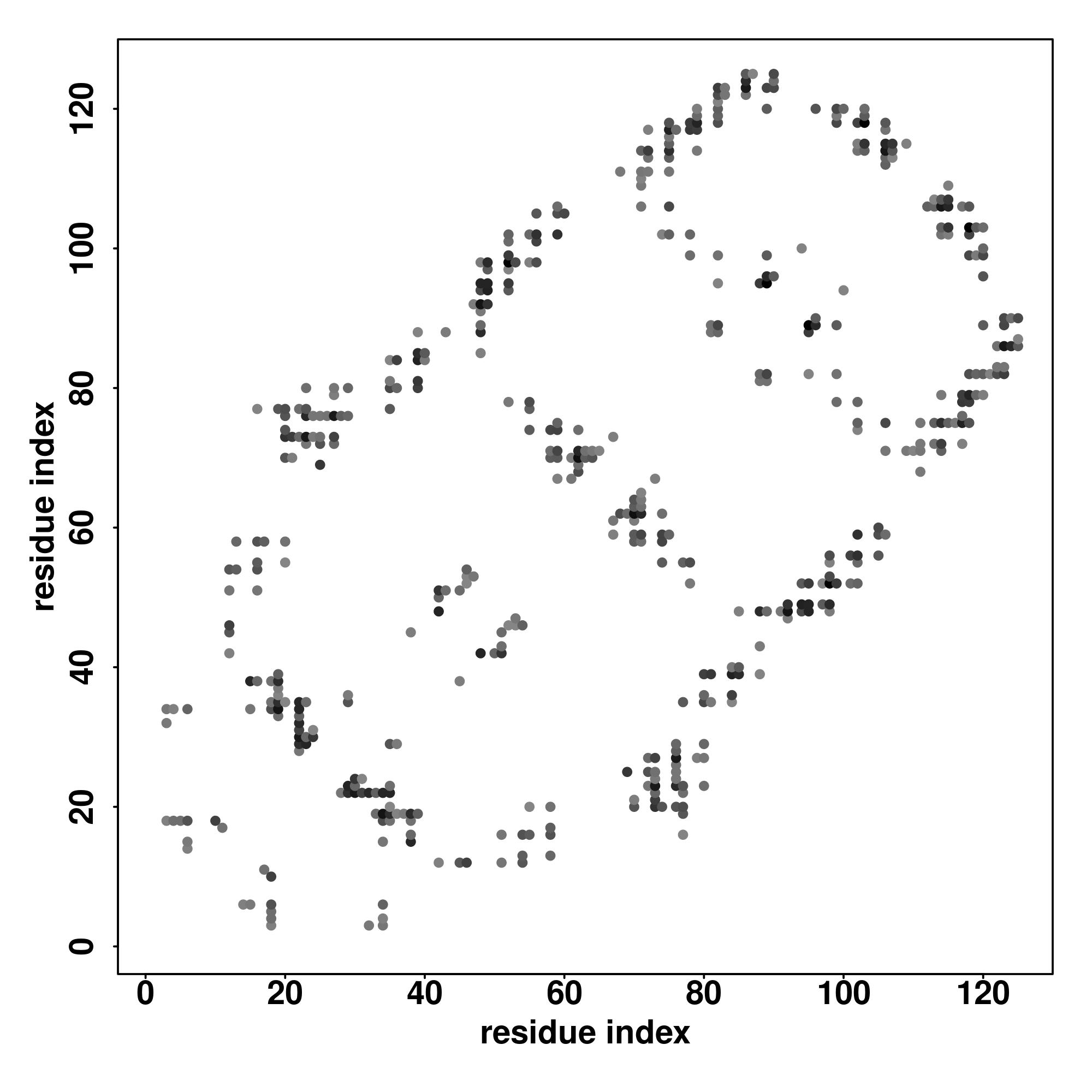 For the contact map, each dot represents a residue pair with predicted contact,