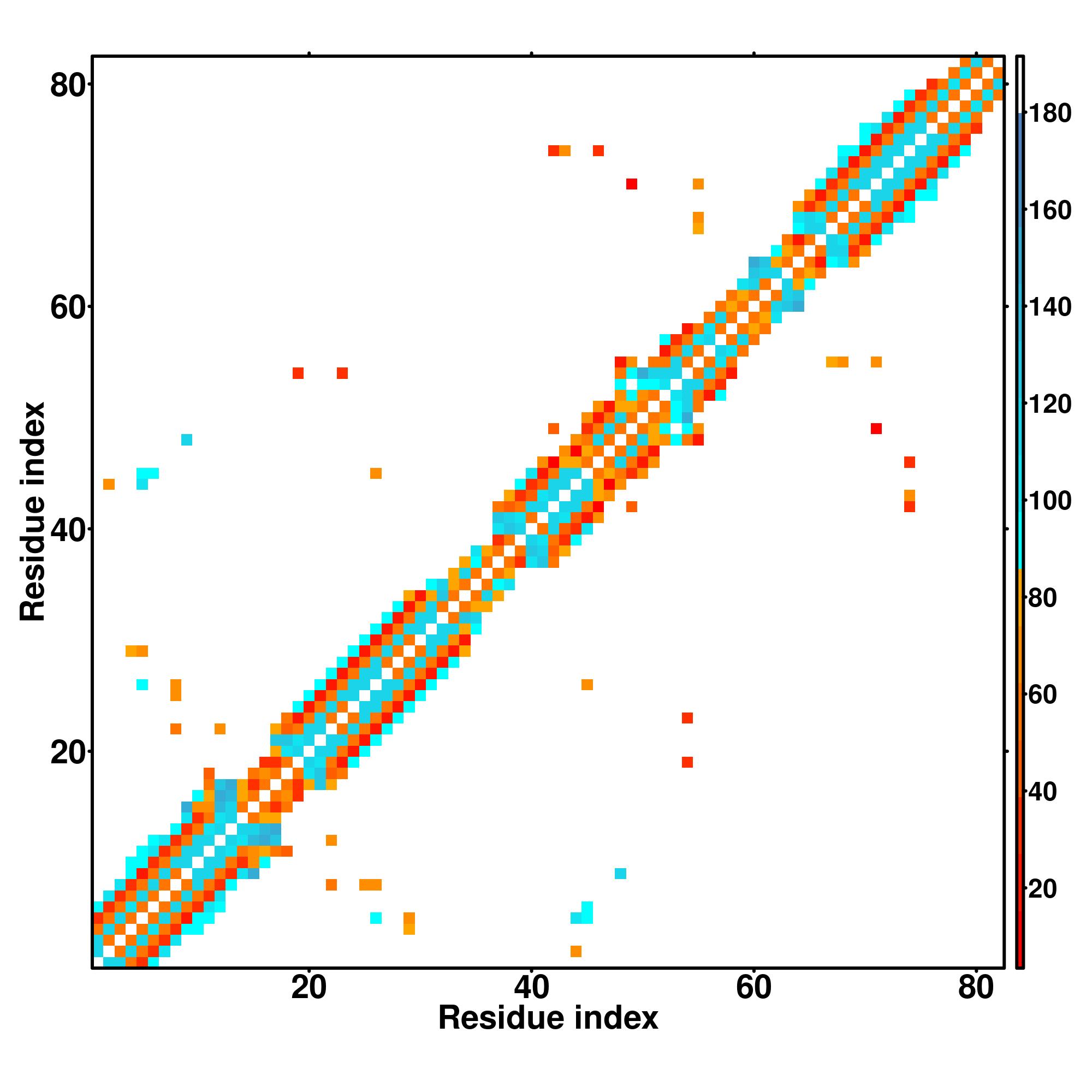 while for the distance map and hydrogen bond network, a color scale represents a distance of 1-20+ angstroms or a angle of 0-180 degree.