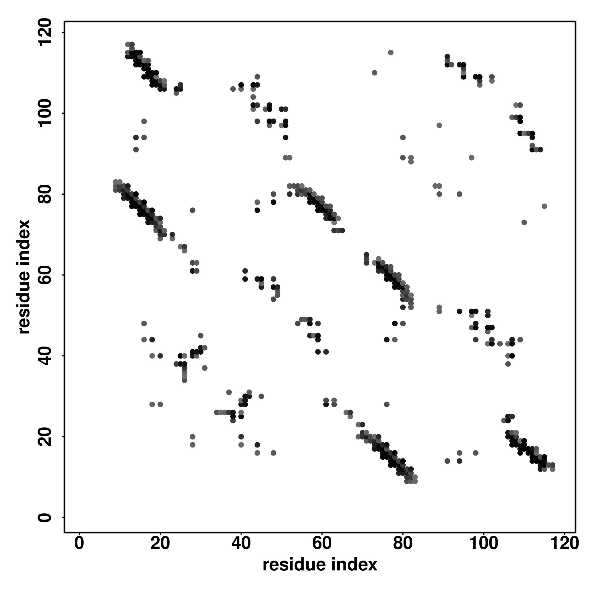 For the contact map, each dot represents a residue pair with predicted contact,