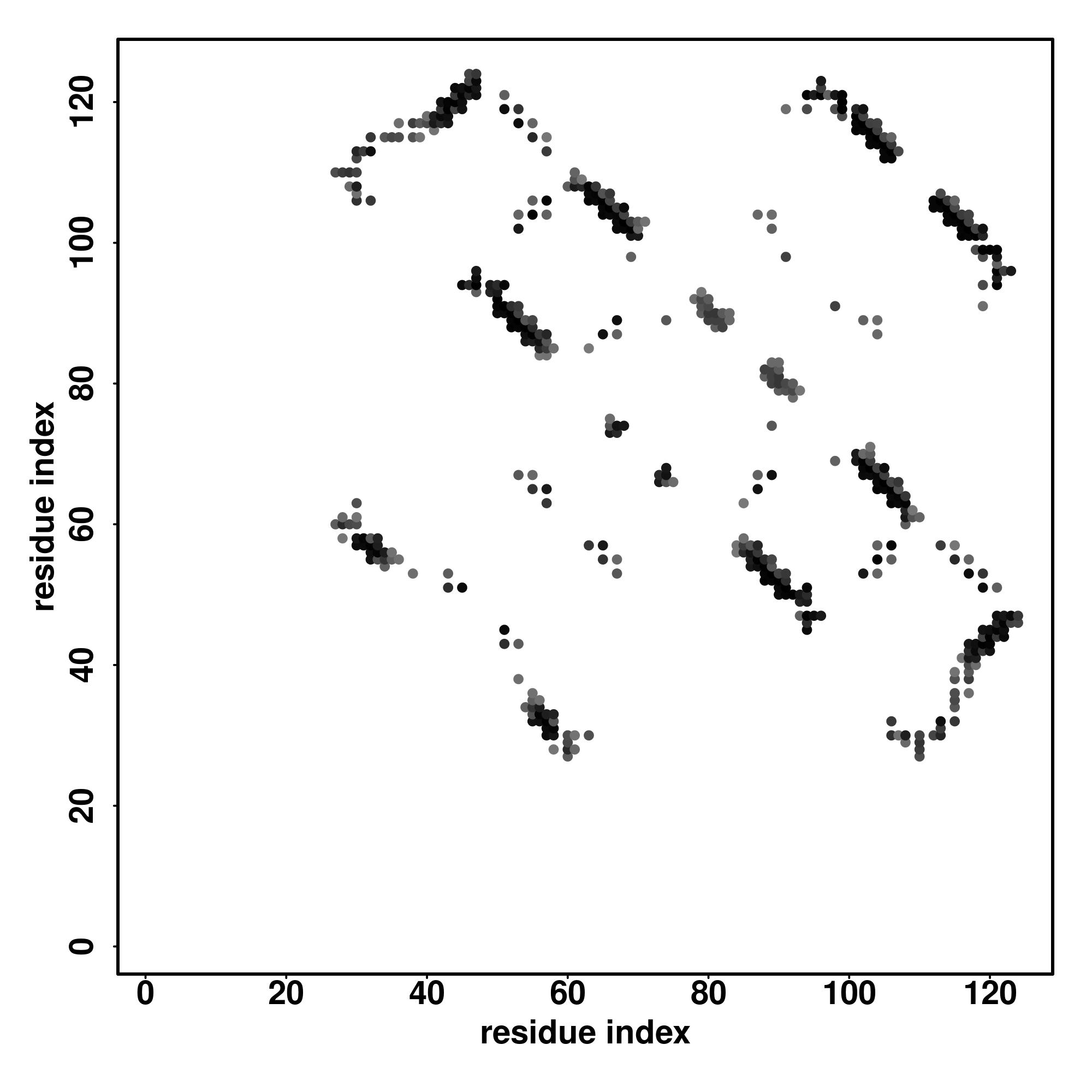 For the contact map, each dot represents a residue pair with predicted contact,