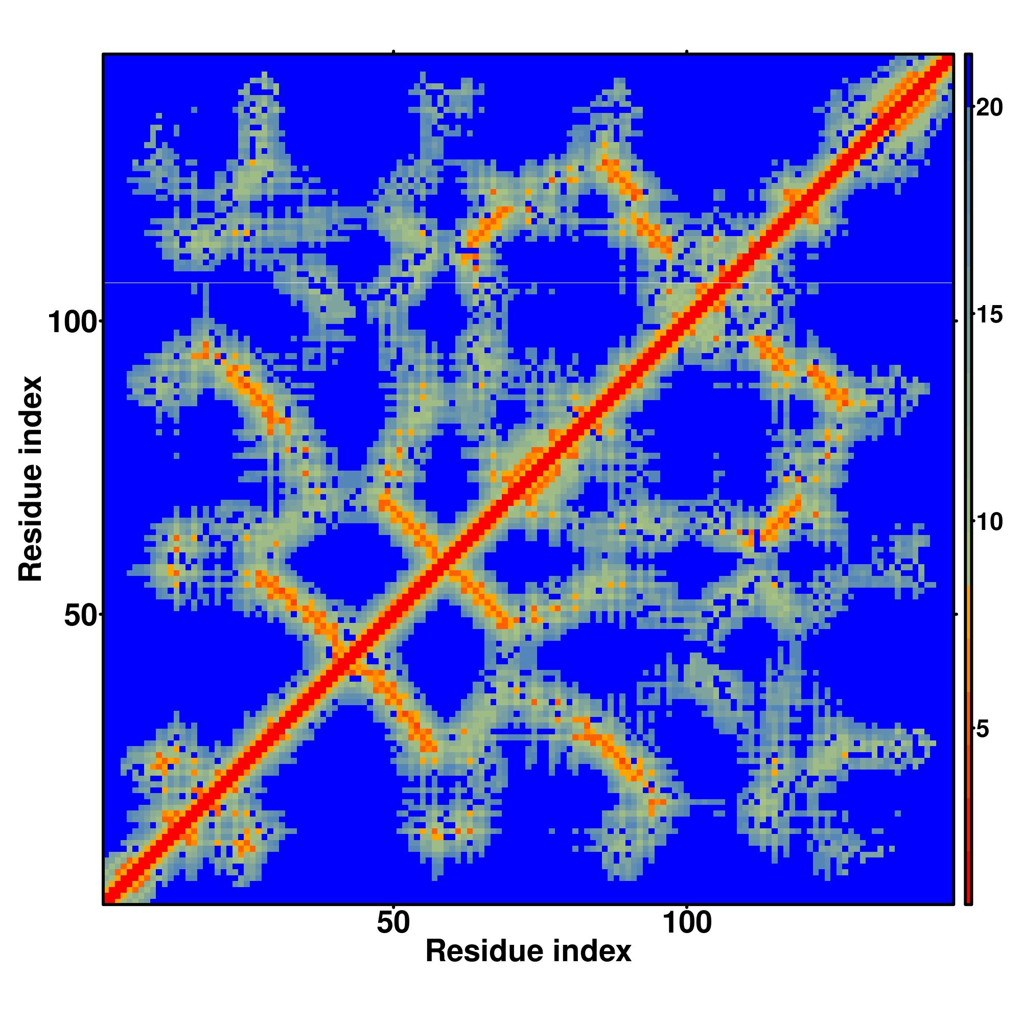 In the contact, distance map and hydrogen bond networks, the axes mark the residue index along the sequence.