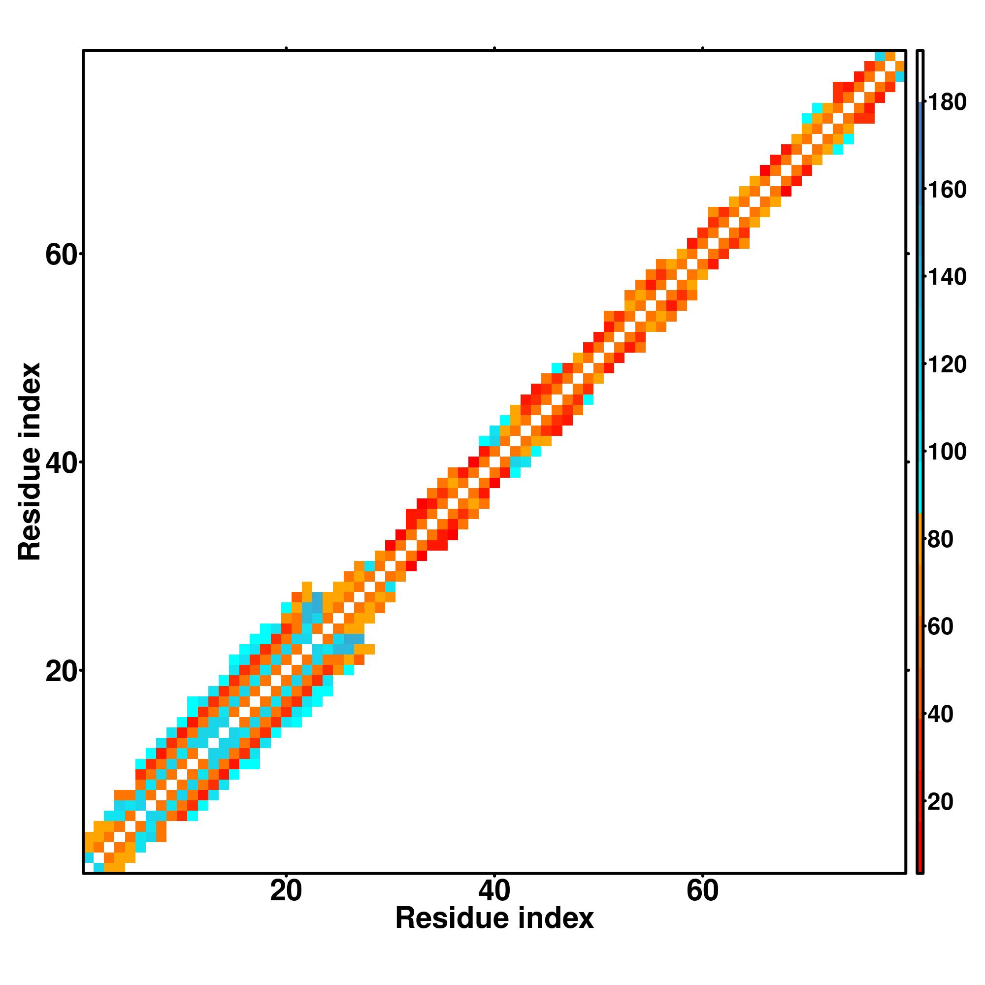 while for the distance map and hydrogen bond network, a color scale represents a distance of 1-20+ angstroms or a angle of 0-180 degree.