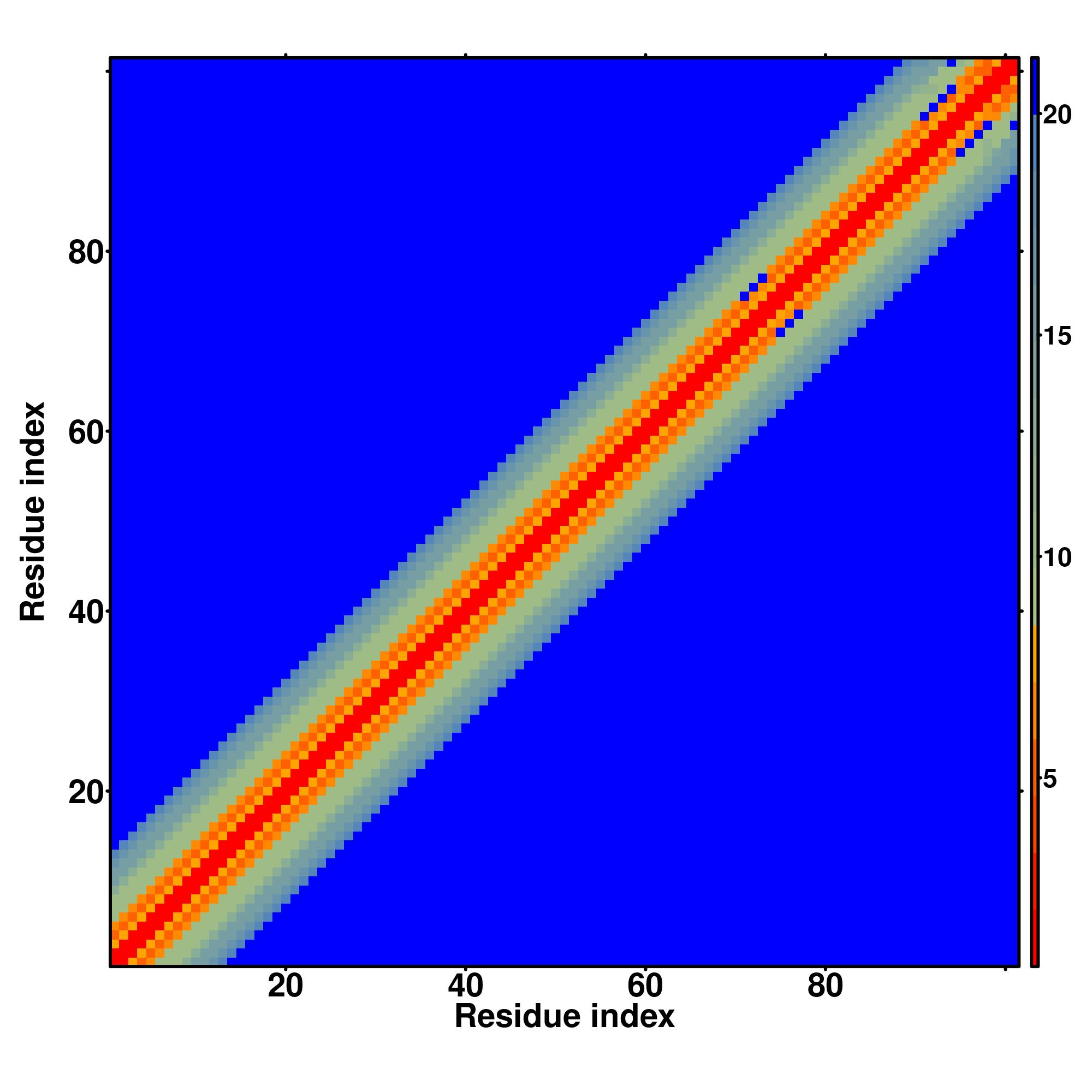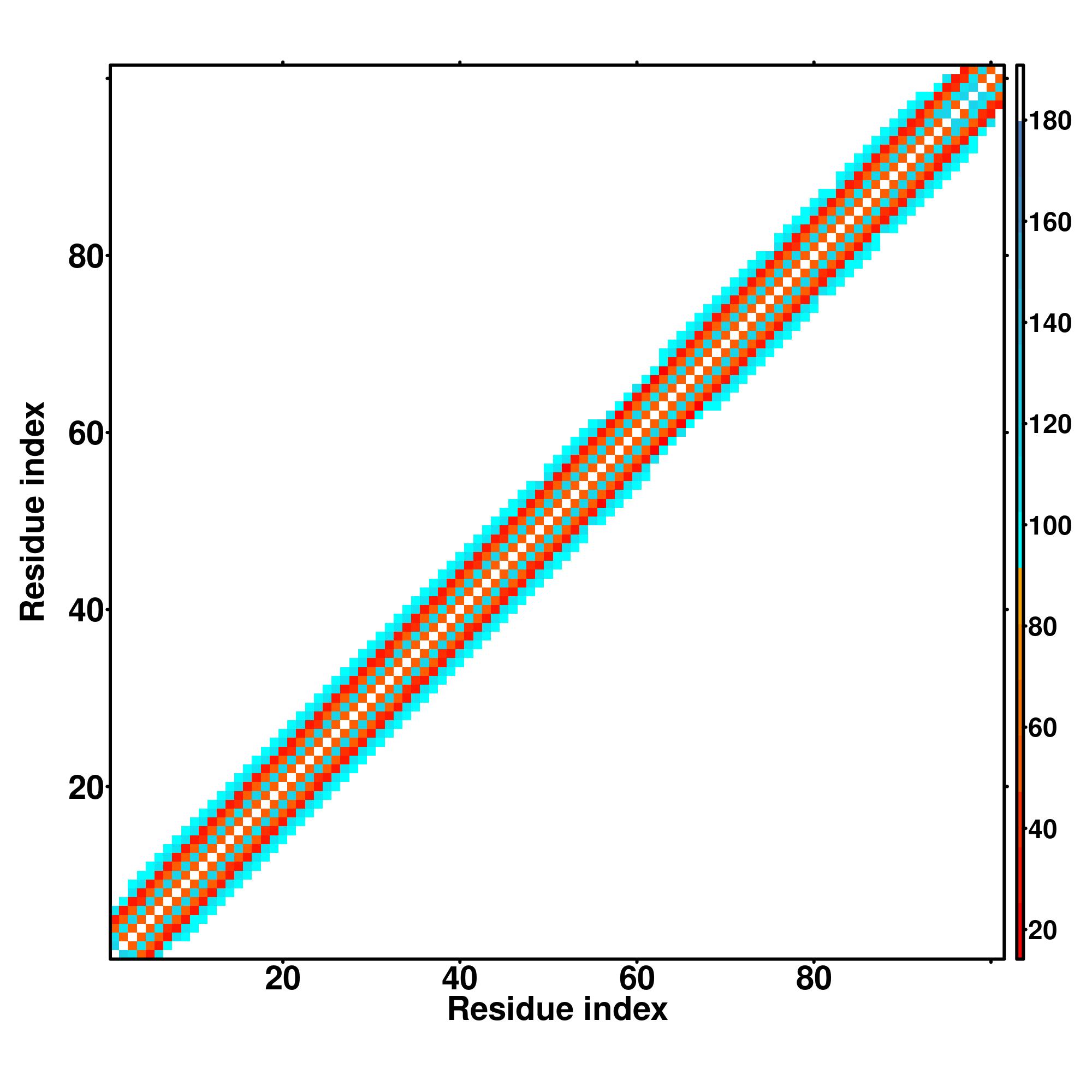 while for the distance map and hydrogen bond network, a color scale represents a distance of 1-20+ angstroms or a angle of 0-180 degree.