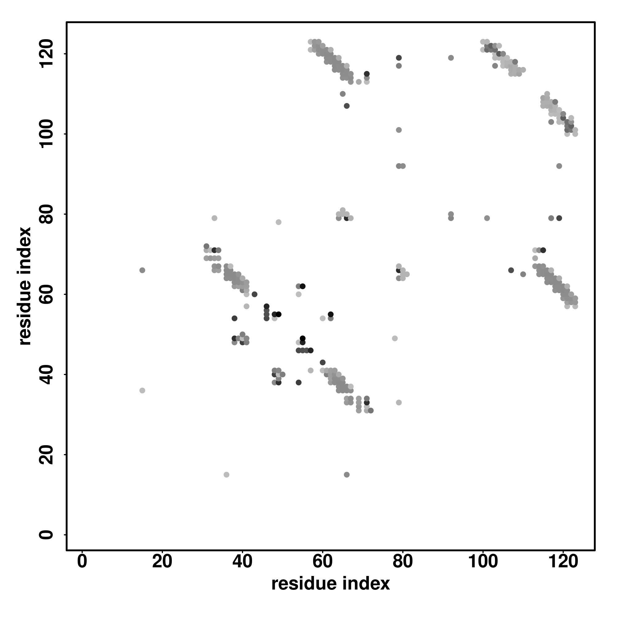 For the contact map, each dot represents a residue pair with predicted contact,
