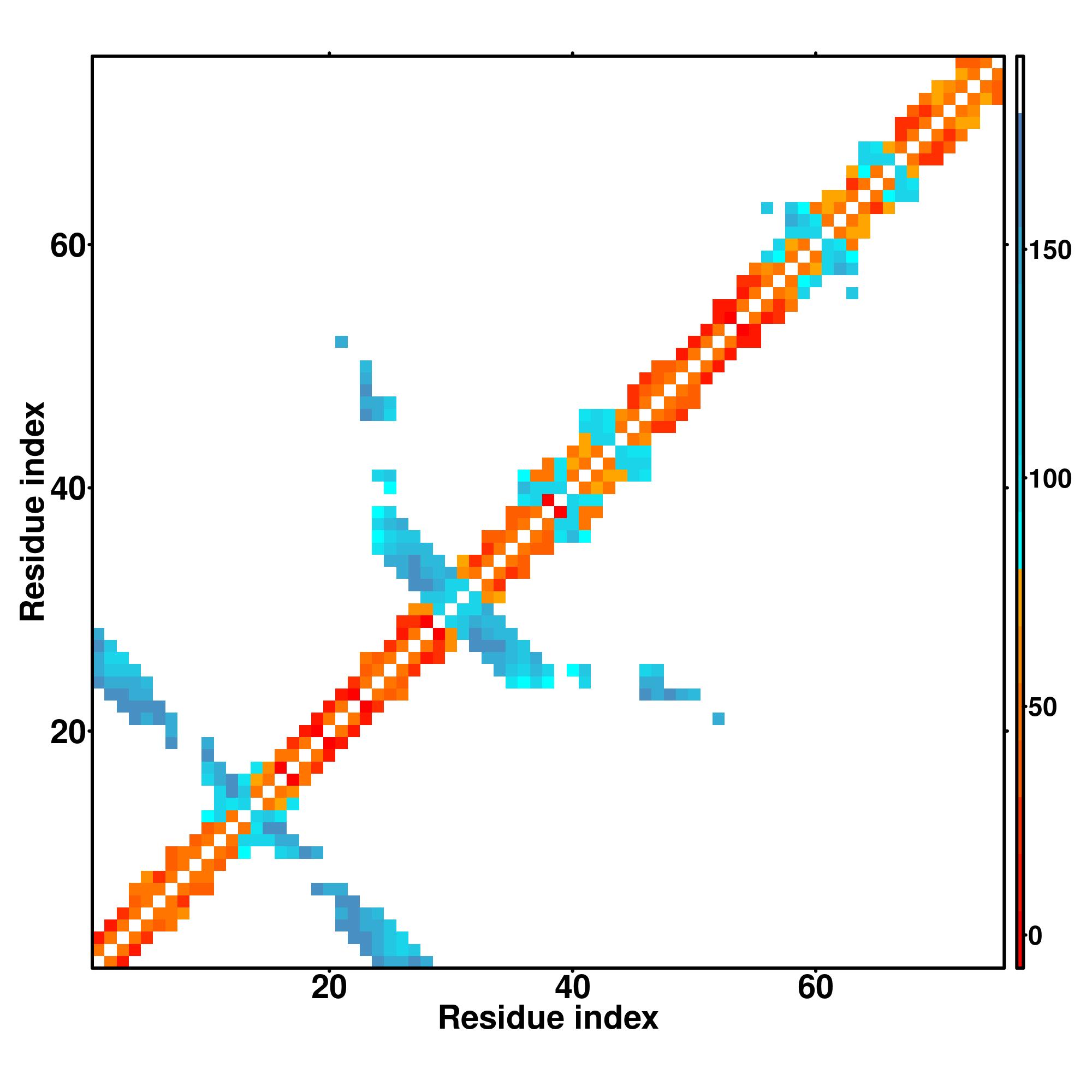 while for the distance map and hydrogen bond network, a color scale represents a distance of 1-20+ angstroms or a angle of 0-180 degree.