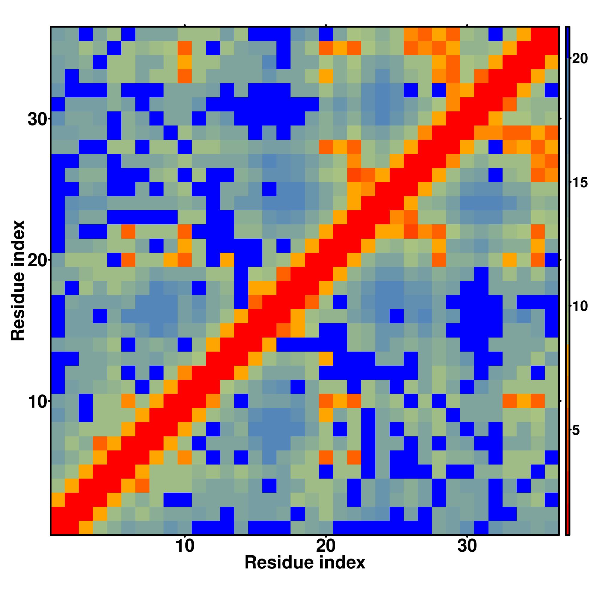 while for the distance map and hydrogen bond network, a color scale represents a distance of 1-20+ angstroms or a angle of 0-180 degree.
