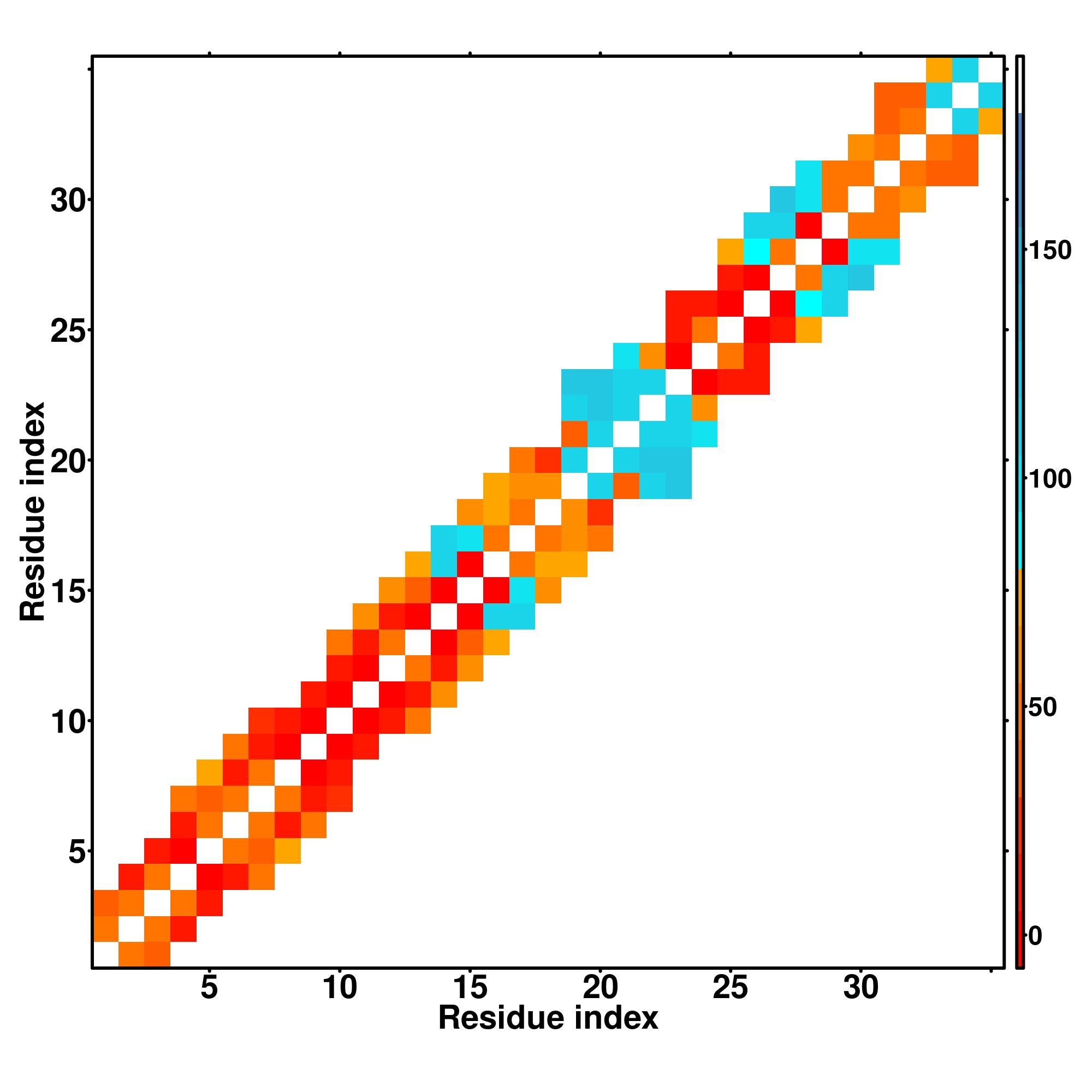 while for the distance map and hydrogen bond network, a color scale represents a distance of 1-20+ angstroms or a angle of 0-180 degree.