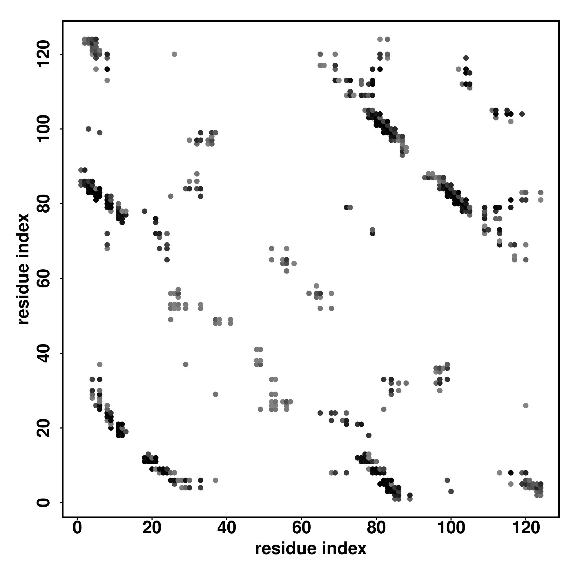 For the contact map, each dot represents a residue pair with predicted contact,