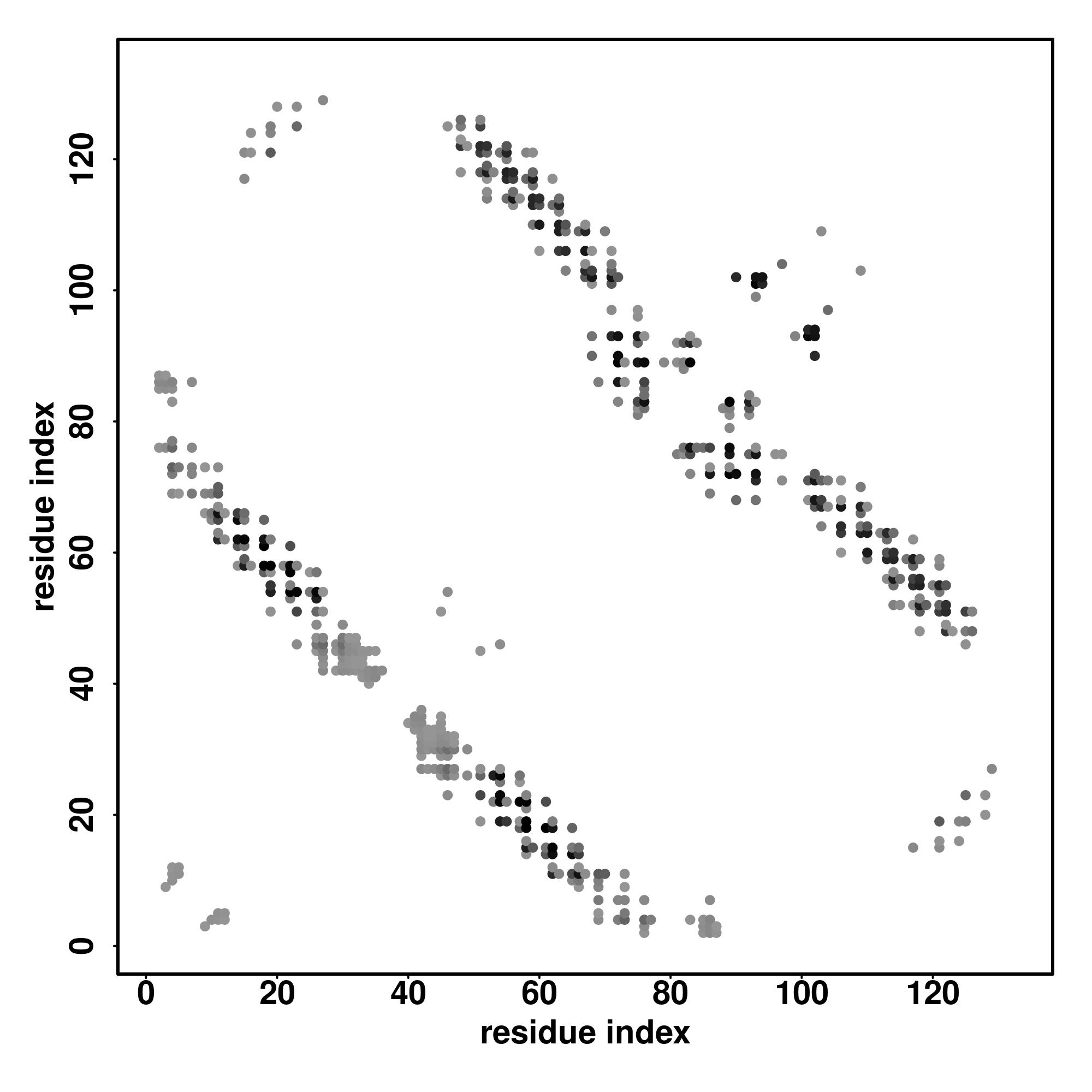 For the contact map, each dot represents a residue pair with predicted contact,