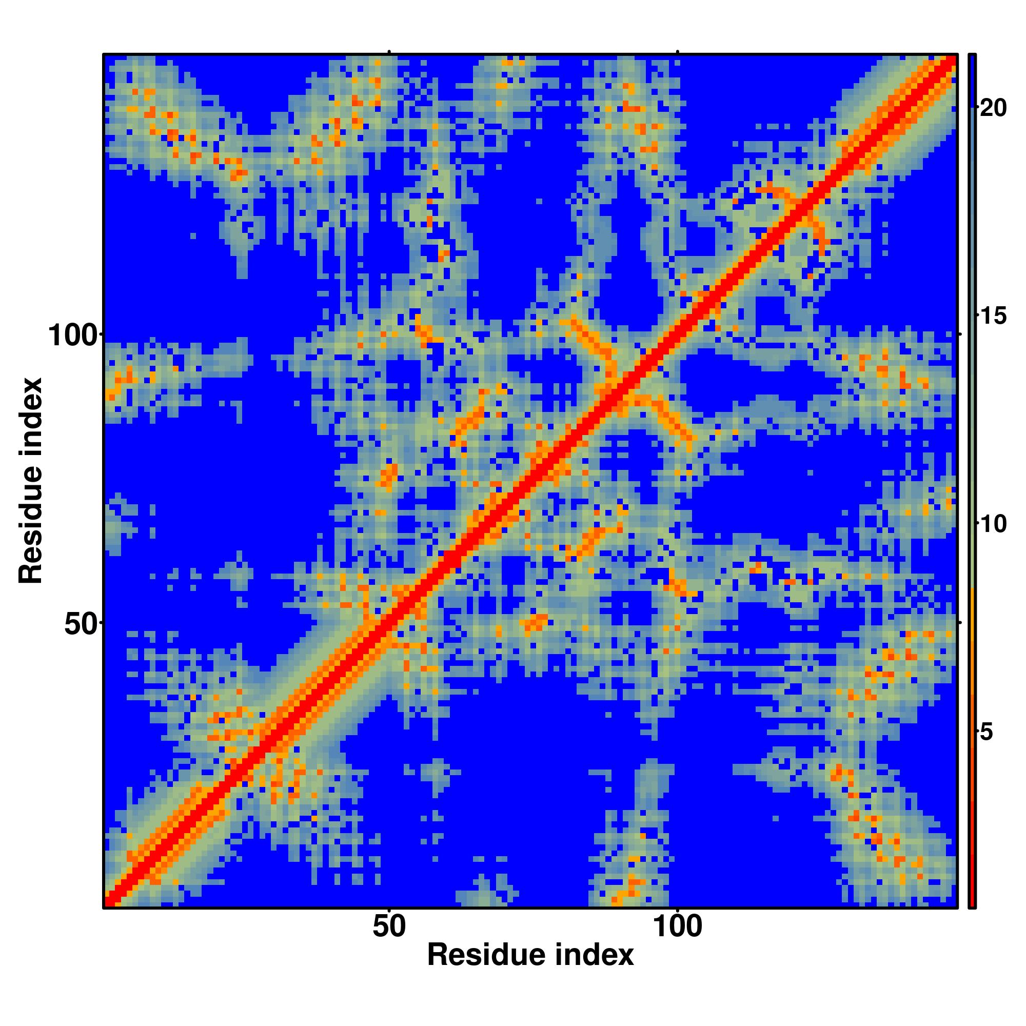 In the contact, distance map and hydrogen bond networks, the axes mark the residue index along the sequence.