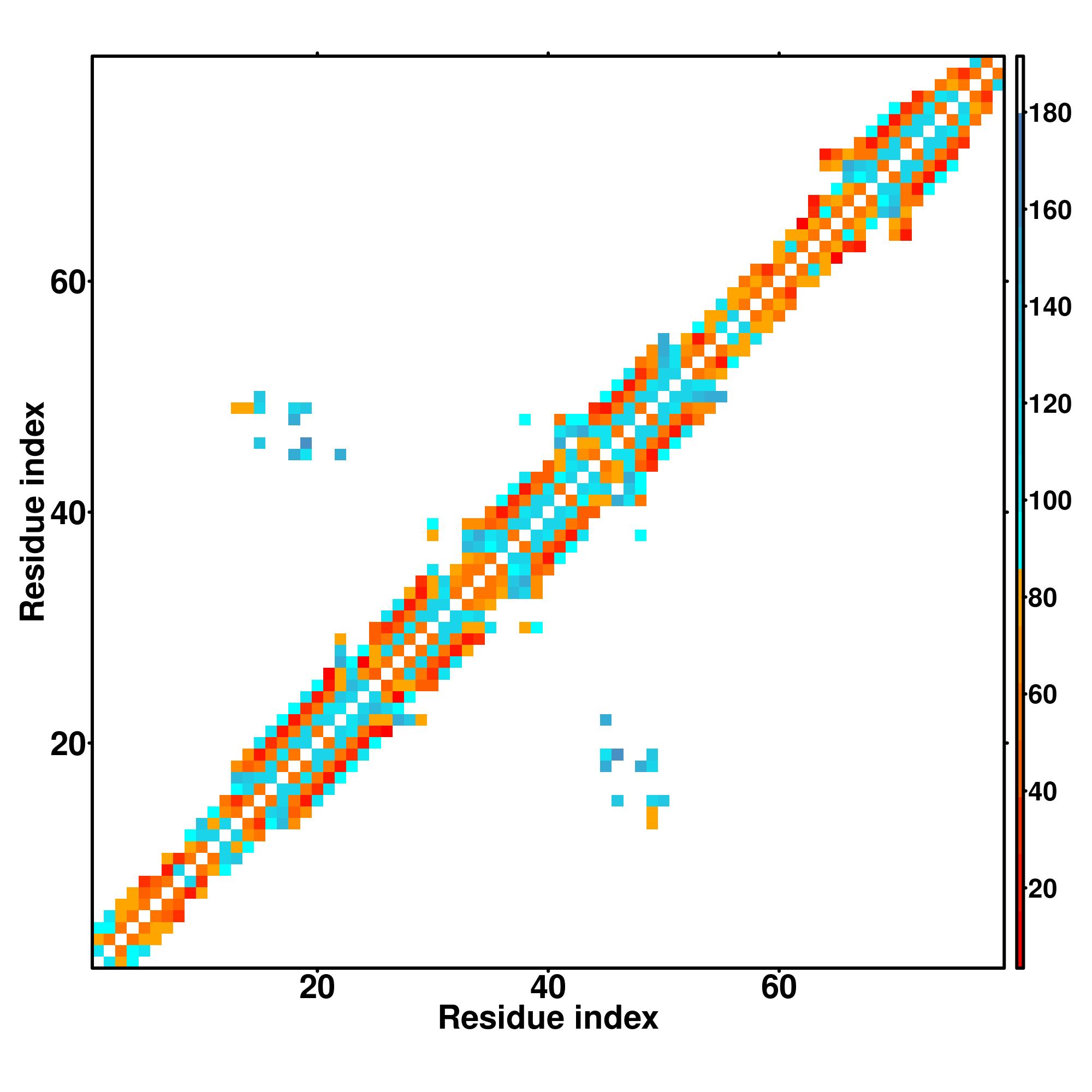 while for the distance map and hydrogen bond network, a color scale represents a distance of 1-20+ angstroms or a angle of 0-180 degree.