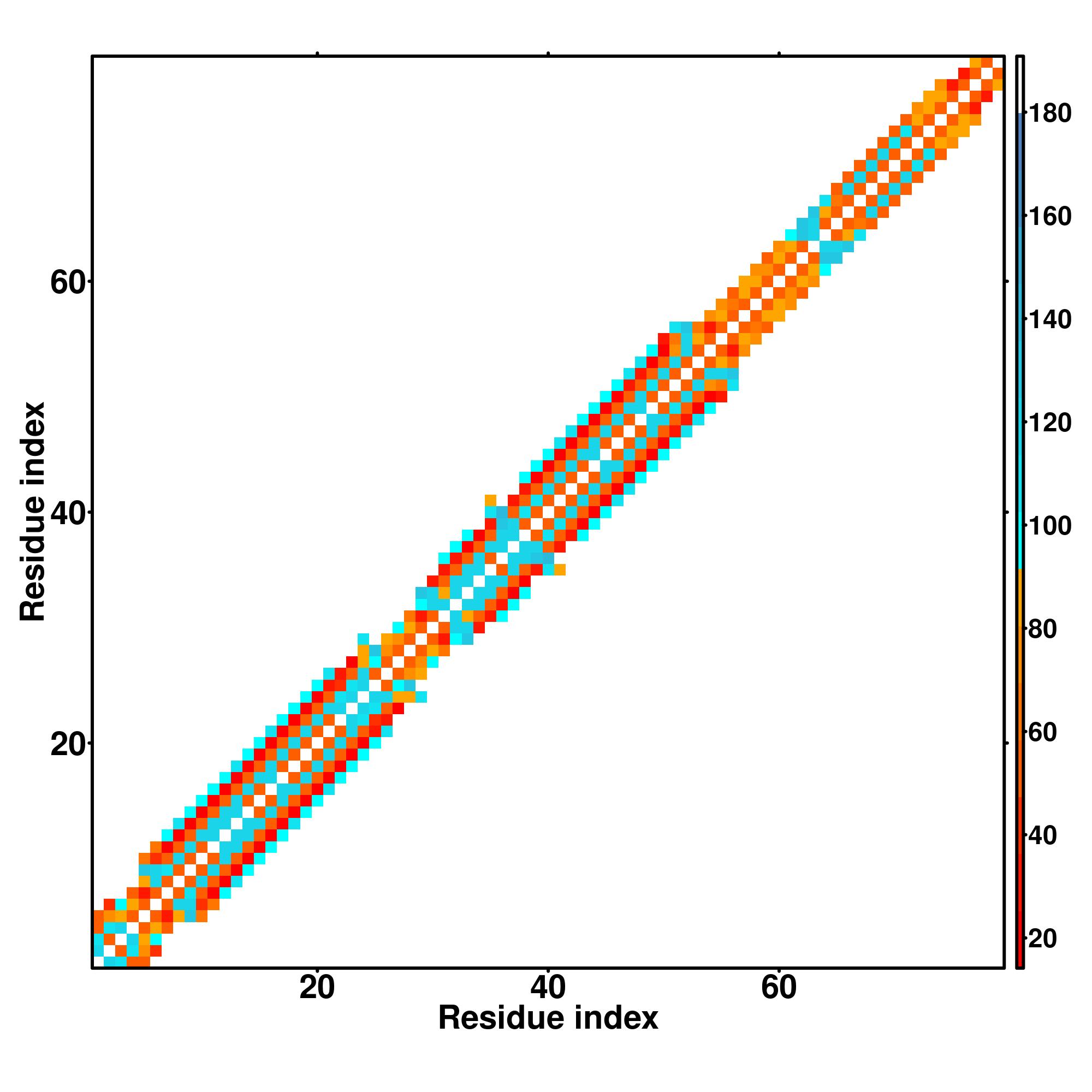 while for the distance map and hydrogen bond network, a color scale represents a distance of 1-20+ angstroms or a angle of 0-180 degree.