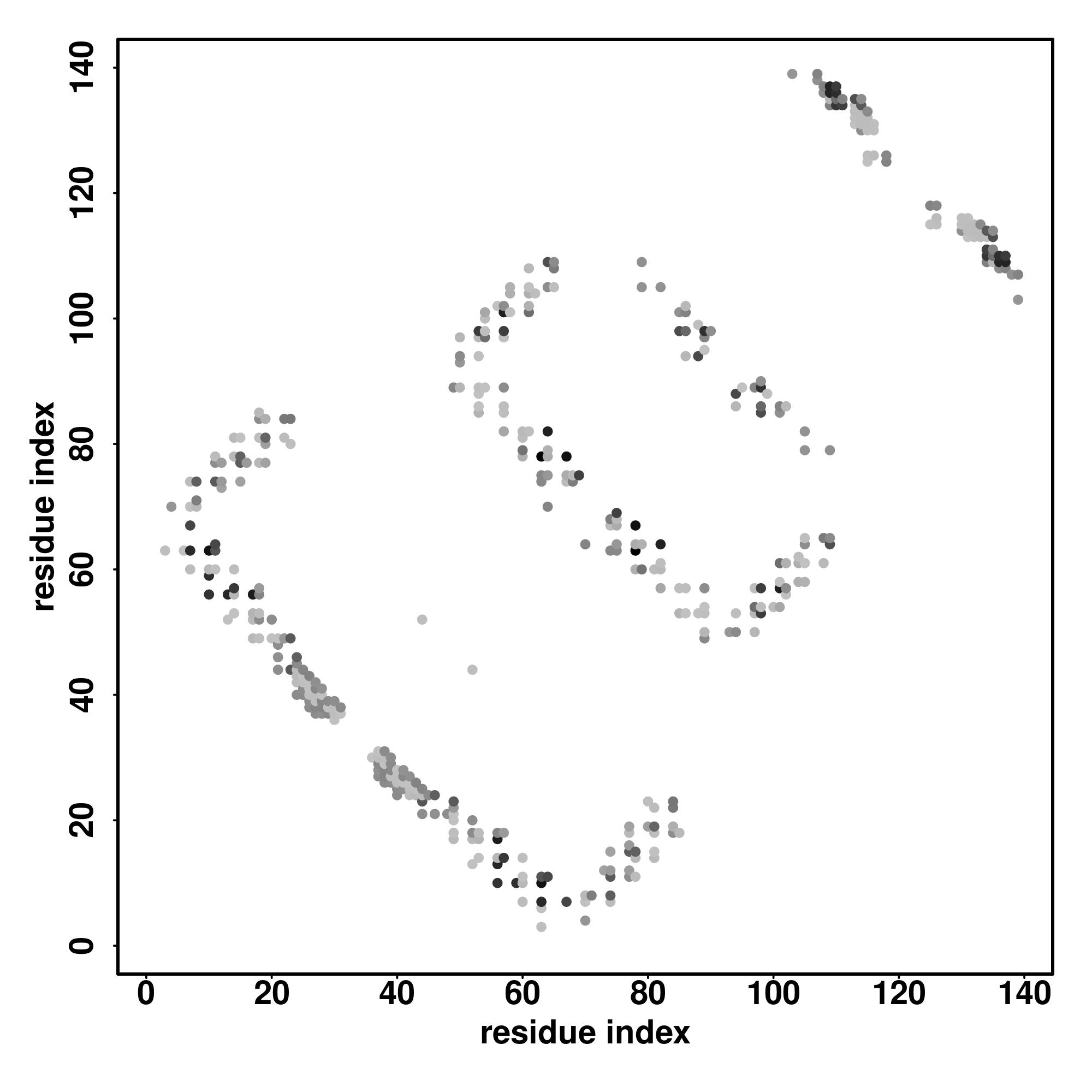 For the contact map, each dot represents a residue pair with predicted contact,