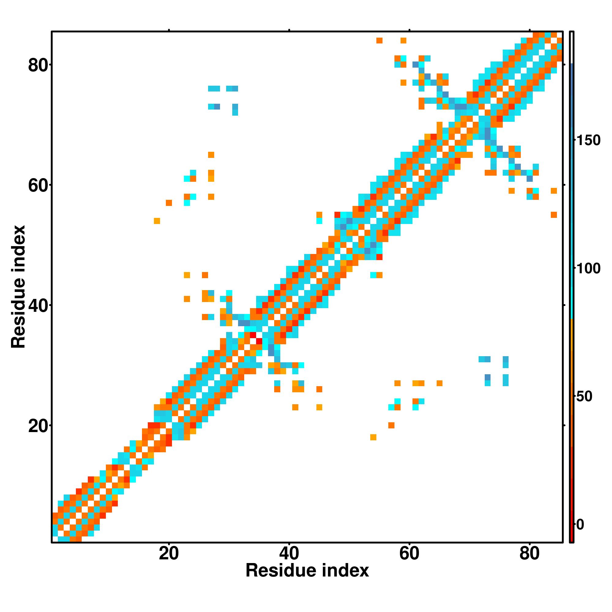 while for the distance map and hydrogen bond network, a color scale represents a distance of 1-20+ angstroms or a angle of 0-180 degree.