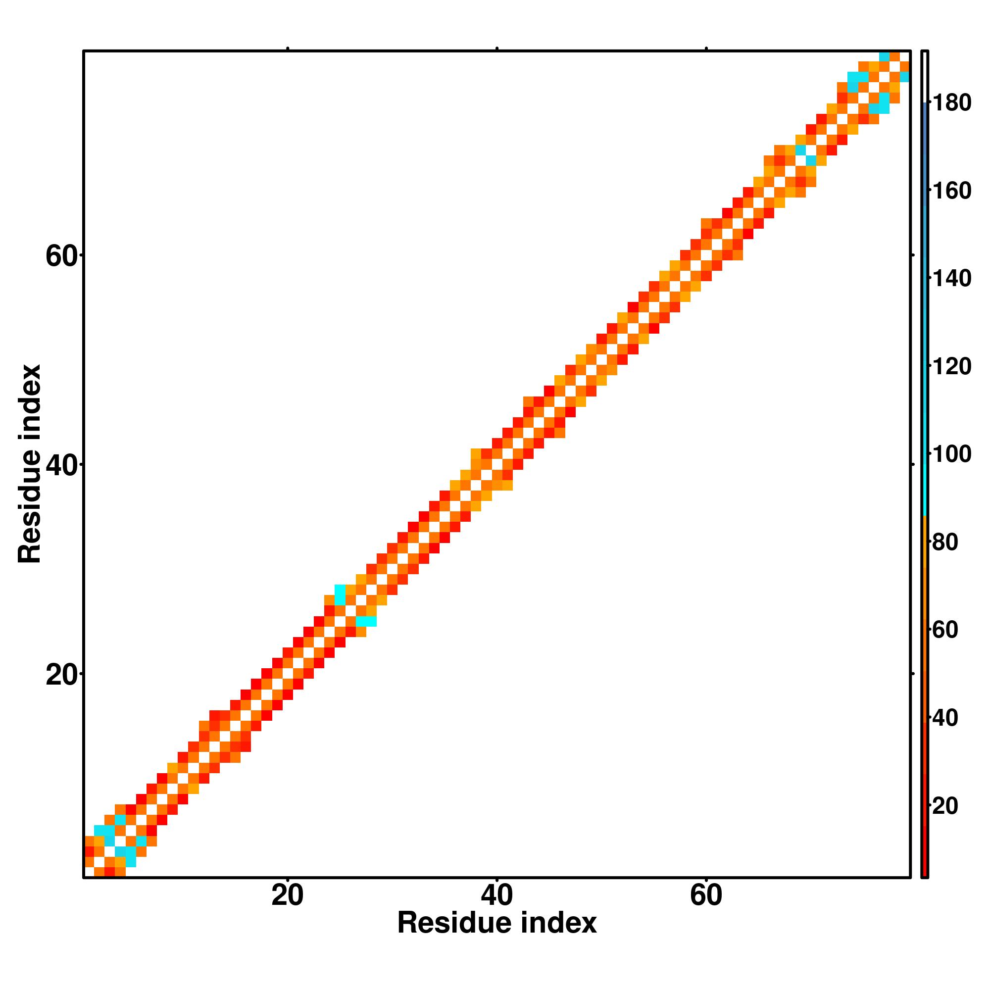 while for the distance map and hydrogen bond network, a color scale represents a distance of 1-20+ angstroms or a angle of 0-180 degree.