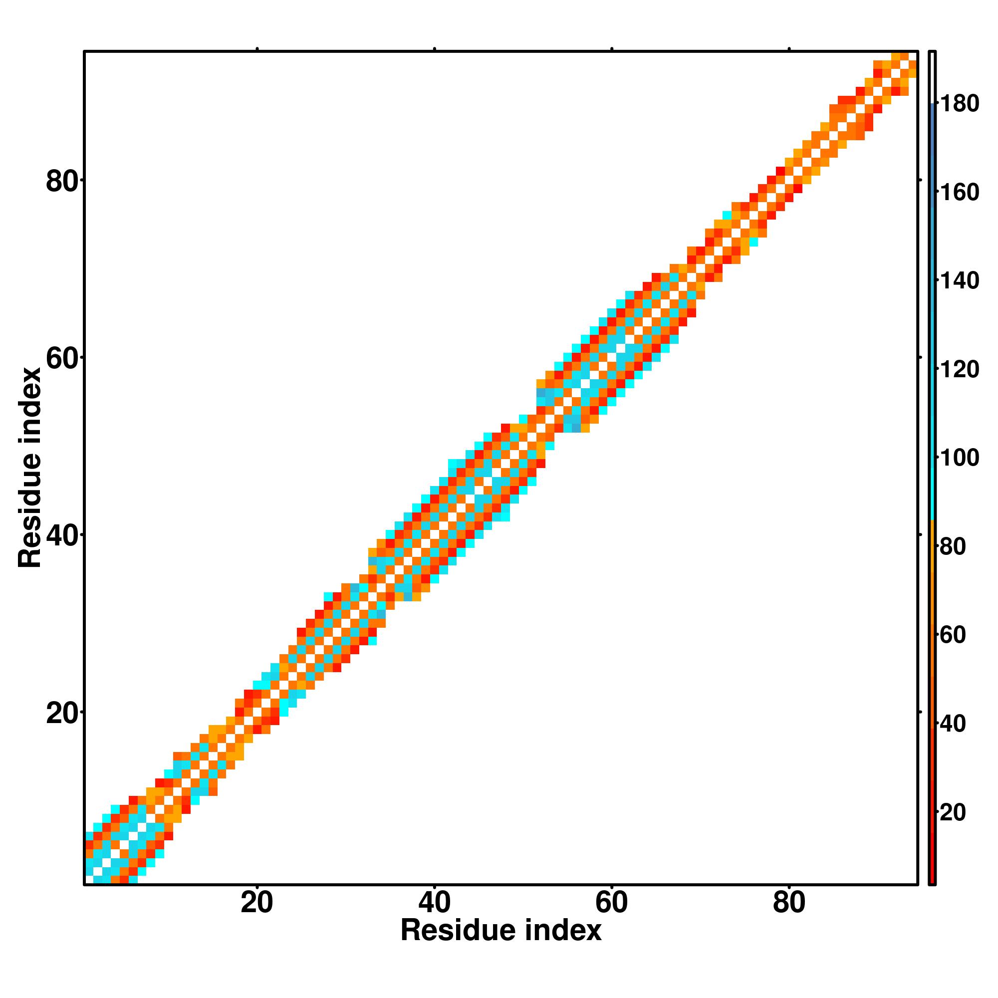while for the distance map and hydrogen bond network, a color scale represents a distance of 1-20+ angstroms or a angle of 0-180 degree.